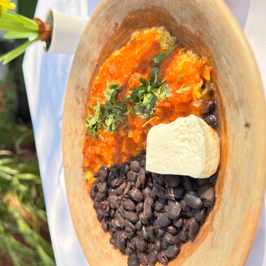 Huevos revueltos bañados en una salsa roja picante y con profundo sabor, servidos con frijoles refritos, plátanos y tortillas calientes.