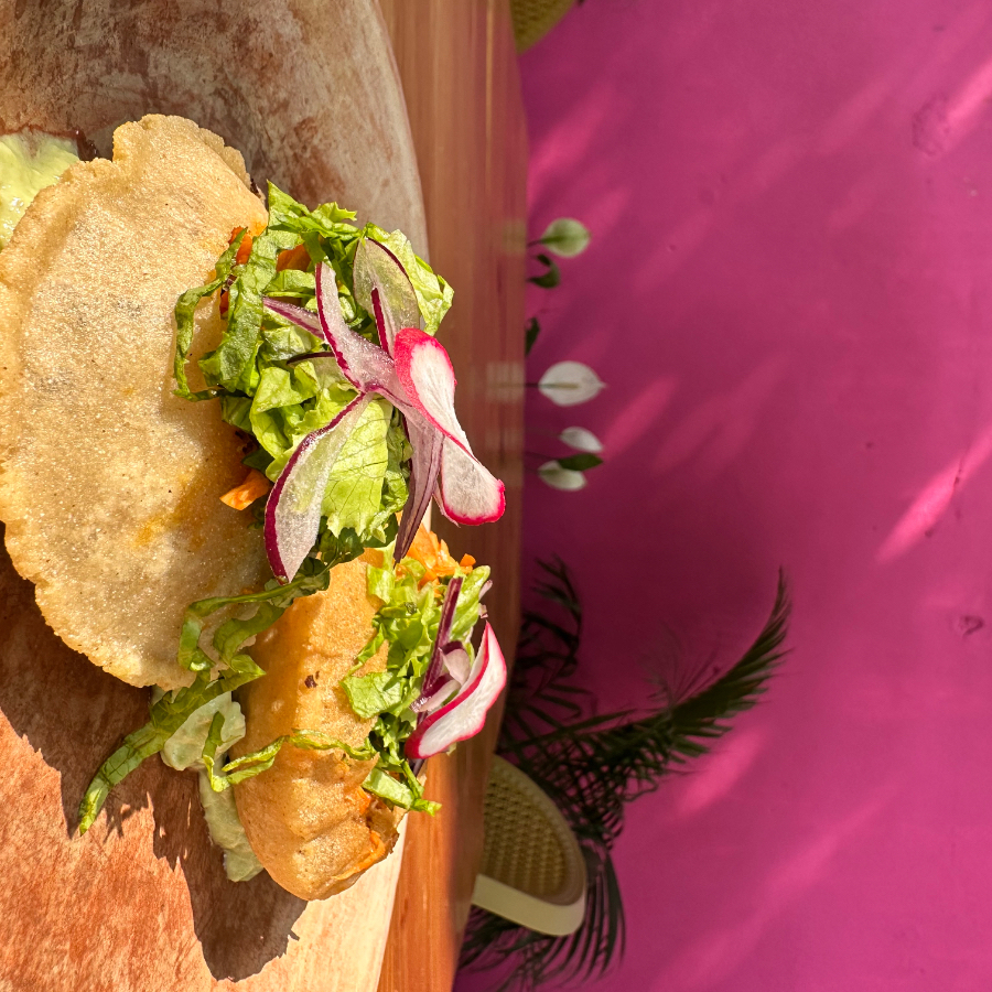 Dos piezas de infladitas con un espejo de aguacate, rellenas de frijoles y pollo al pibil, coronada con lechuga, rábano y cebolla morada