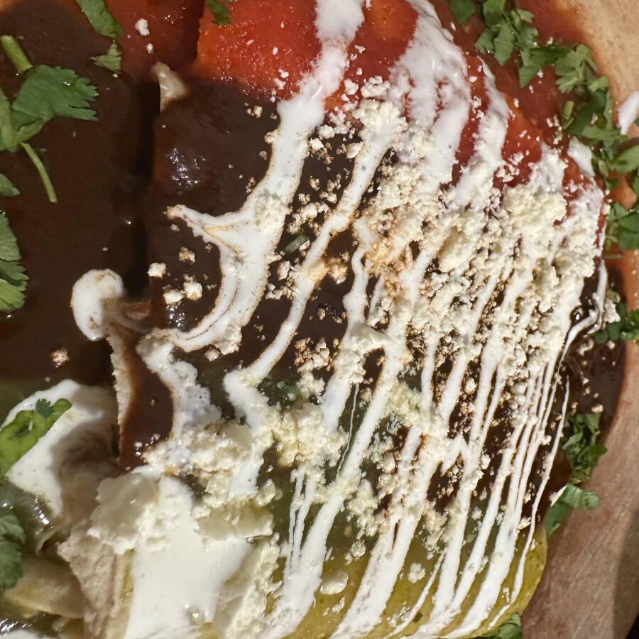 Cuatro piezas de tortillas de maíz rellenas de pollo deshebrado, bañadas en salsa a elegir entre roja, verde, rosa, tricolor o de mole, coronadas con crema, queso y cebolla.