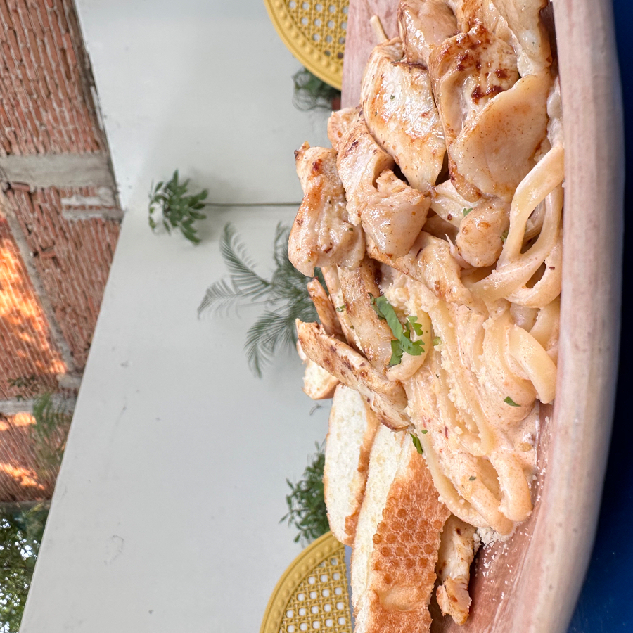 Pasta salteada en crema de chipotle, coronado con pechuga de pollo empanizado o a la plancha y tocino, acompañado de baguette tostado.