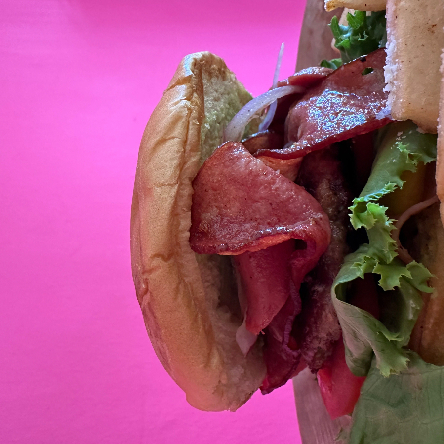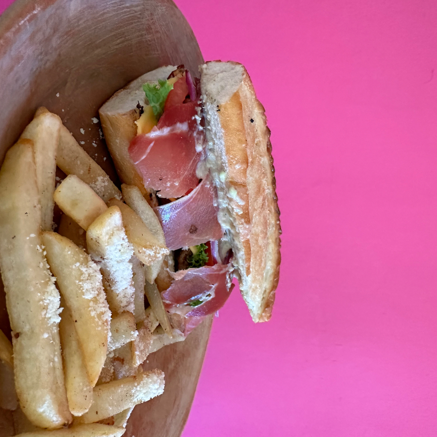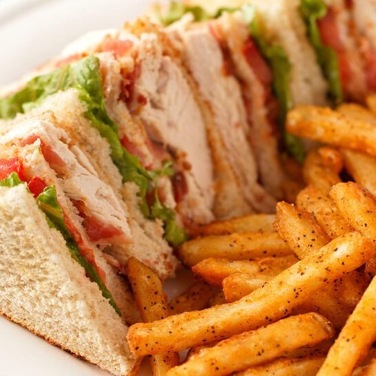 Clásico y sofisticado, con capas de pan brioche ligeramente tostado, pechuga de pollo desherbado, jamón, queso amarillo, cebolla, lechuga fresca y tomate. Acompañado de papas a la francesa.