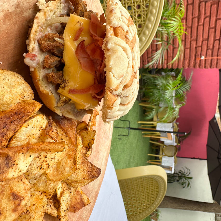 Deliciosa concha de vainilla rellena de fajitas de res empanizada sobre una cama de crema de champiñones, queso amarillo, coronada con cebolla caramelizada. Acompañada de papas crujientes