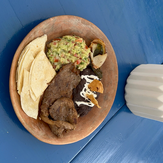 Carne de res asada acompañada de frijoles refritos, guacamole, quesadillas y papas salteadas