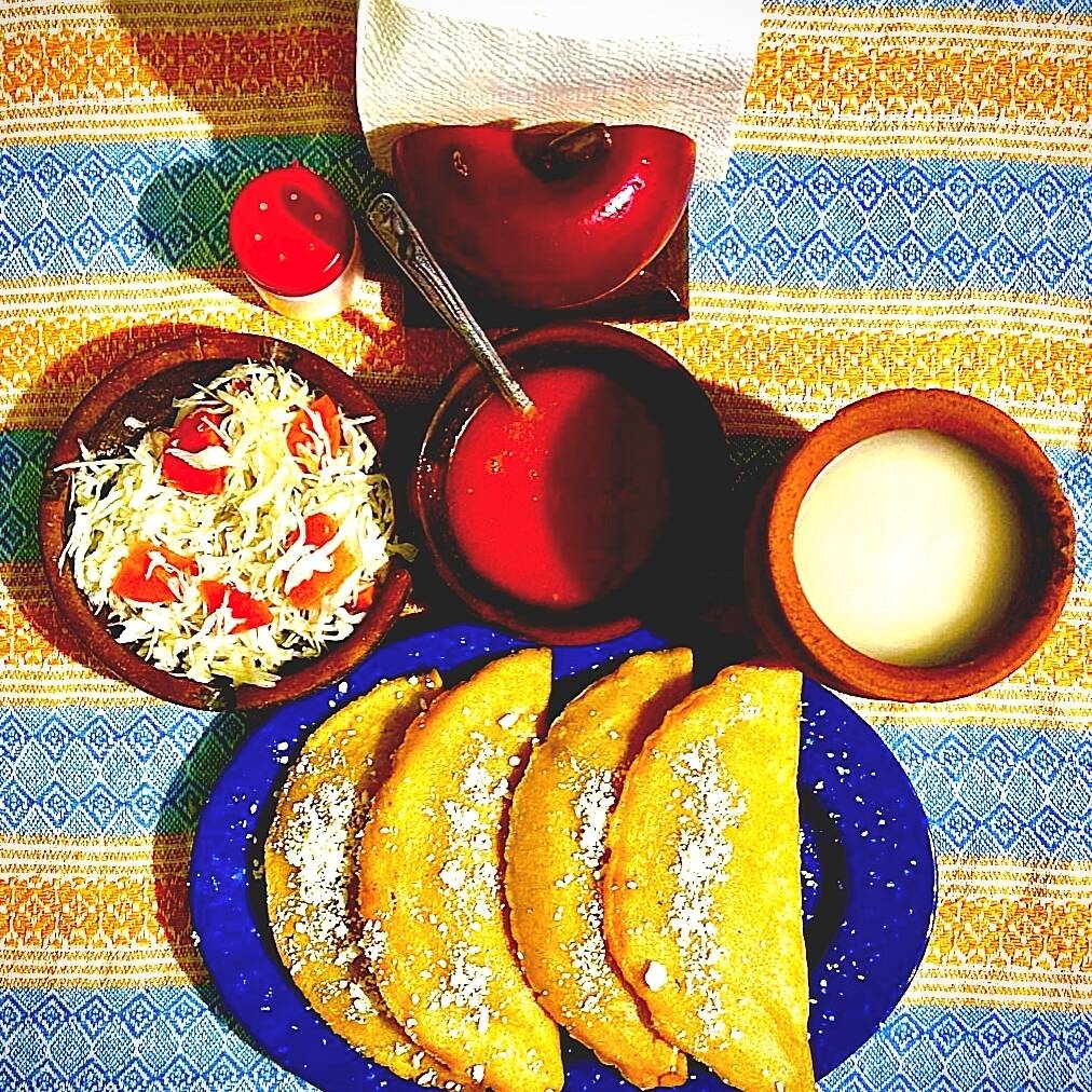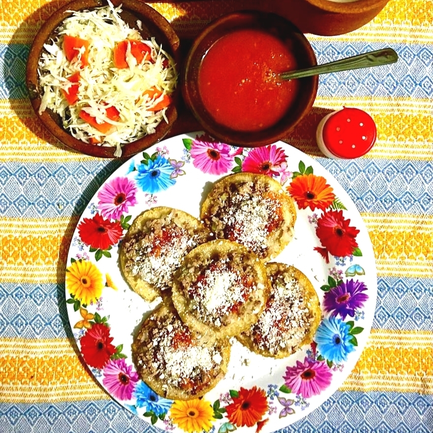 Tortillas de 10cm hechas a mano por encima carné molida de res, salsa de tomate roja y queso seco acompañado de repollo con zanahoria en escabeche.