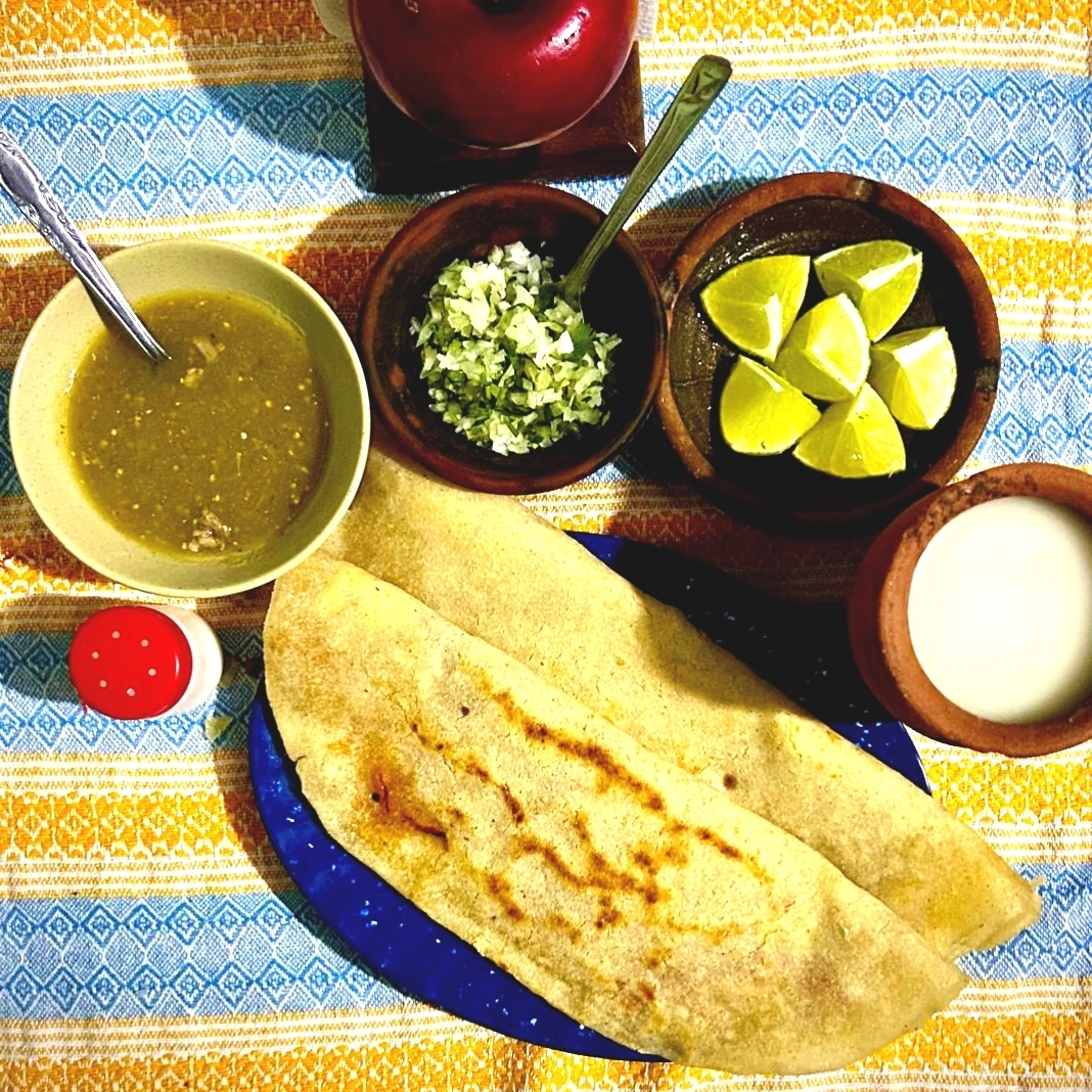 Tortillas de 30cm hechas a mano por dentro quesillo y carne a su elección acompañado de cebolla con cilantro, salsa verde y limones