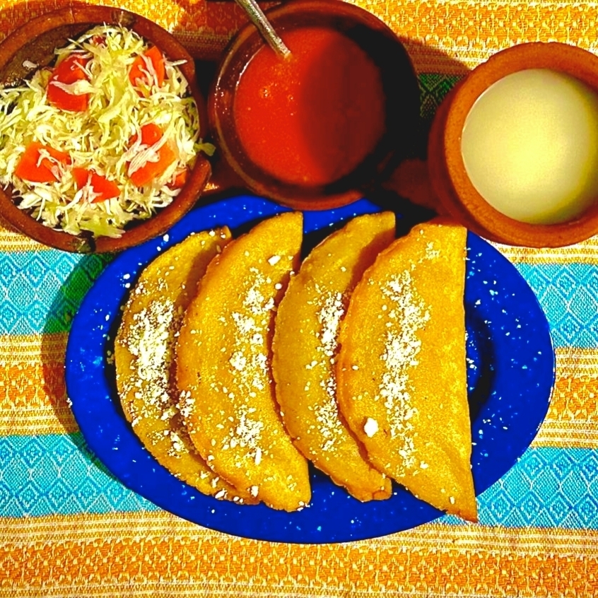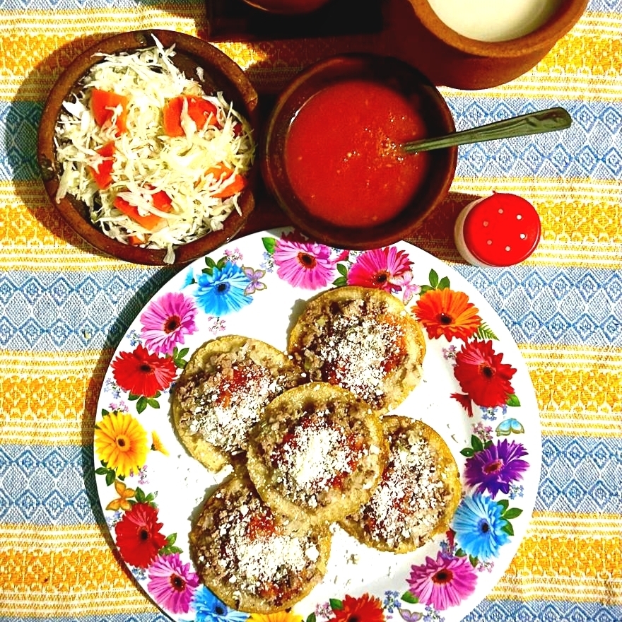 Tortillas de 10cm hechas a mano por encima carne molida de res, salsa de tomate roja y queso seco acompañado de repollo con zanahoria en escabeche
