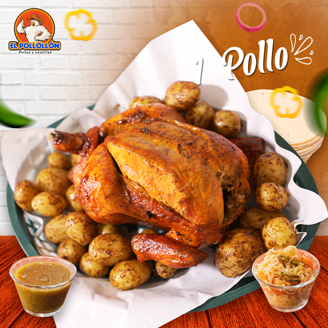 Pollo Entero acompañado de nuestra deliciosa salsa roja, frijoles, papas.