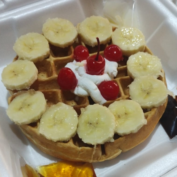 Wafle dorados y crujientes, acompañados Cerezas, Plátano en rodajas, un toque de chantilly, sirope dulce de su preferencia, un desayuno irresistible que combina lo suave y lo crujiente con el frescor de la fruta y la dulzura perfecta. Ideal para consentirse.