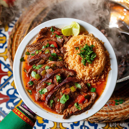 Jugosos bisteces cocinados en una salsa tradicional de tomate, cebolla, jalapeño acompañado de arroz
