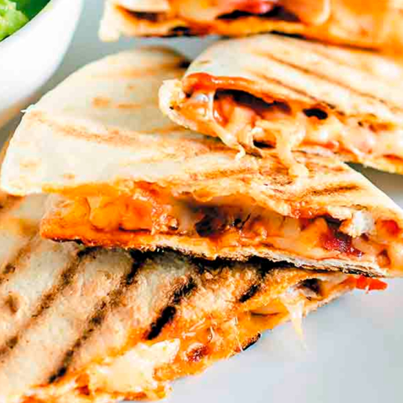 2 Tortillas de harina rellena de carne al pastor con queso fundido, asada a la plancha hasta quedar doradita y servida en triángulos