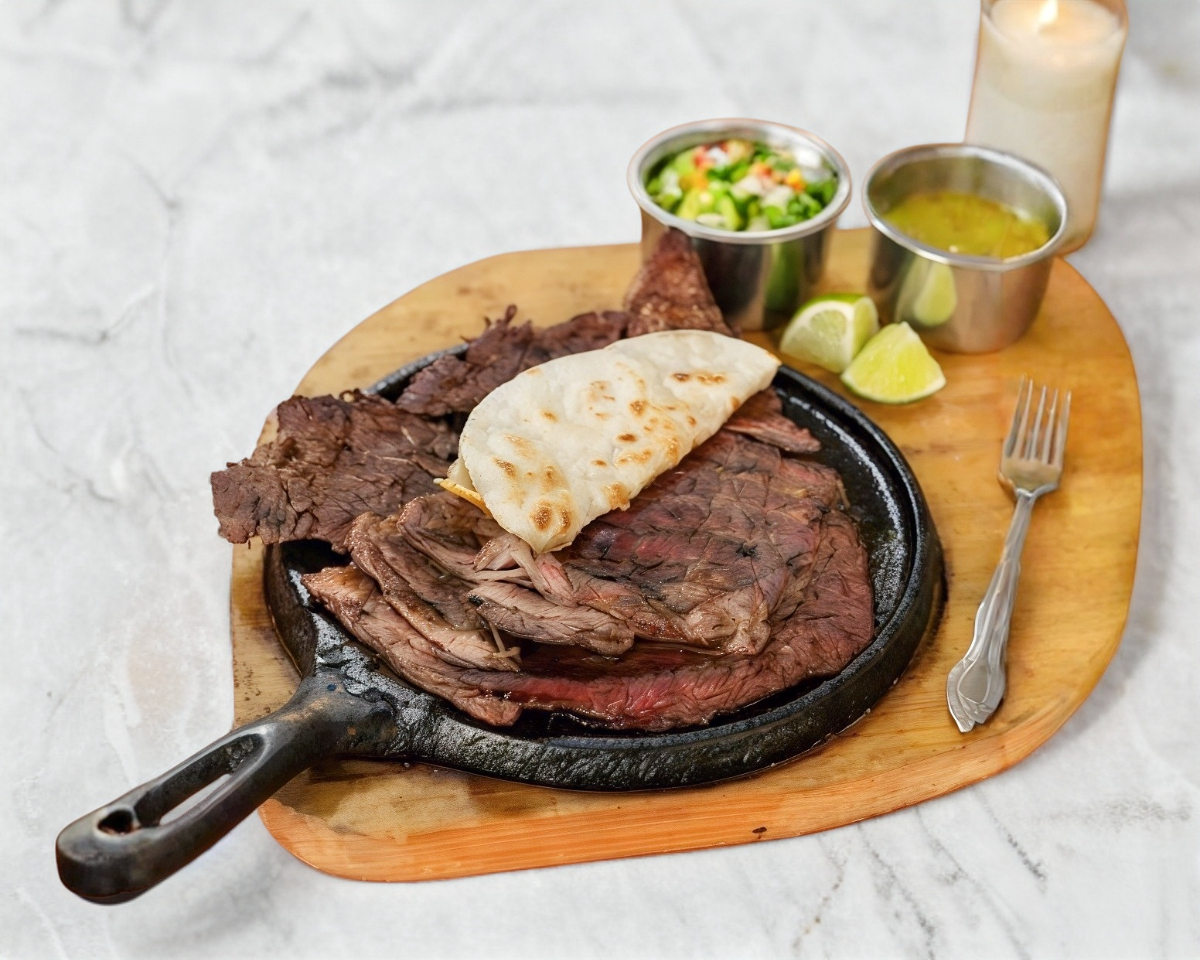 Tortilla dorada al carbón con queso manchego y deliciosa carne de arrachera.