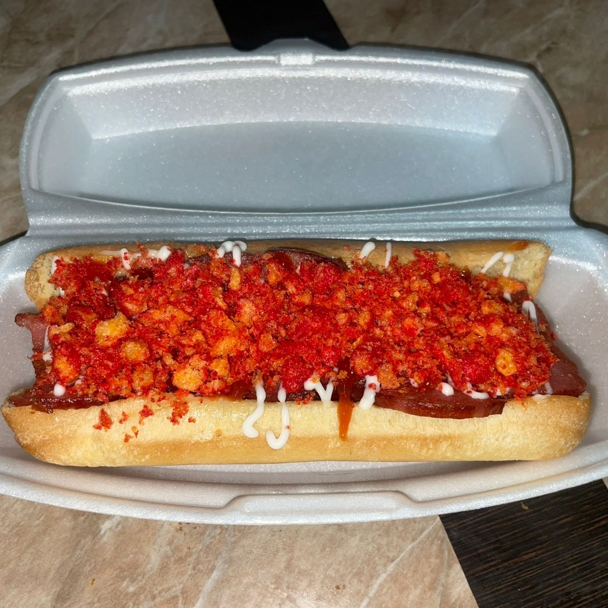 Salchicha, tocino, mostaza y chetos flaming hot