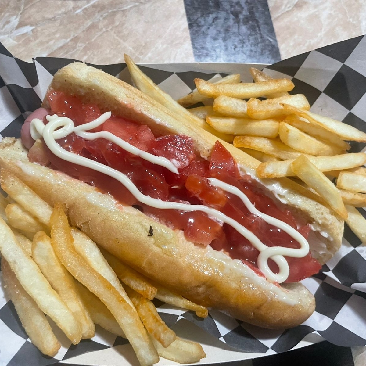Hot dog sencillo, salchicha, tomate, cebolla más porción de papas