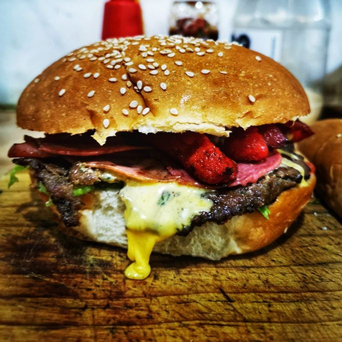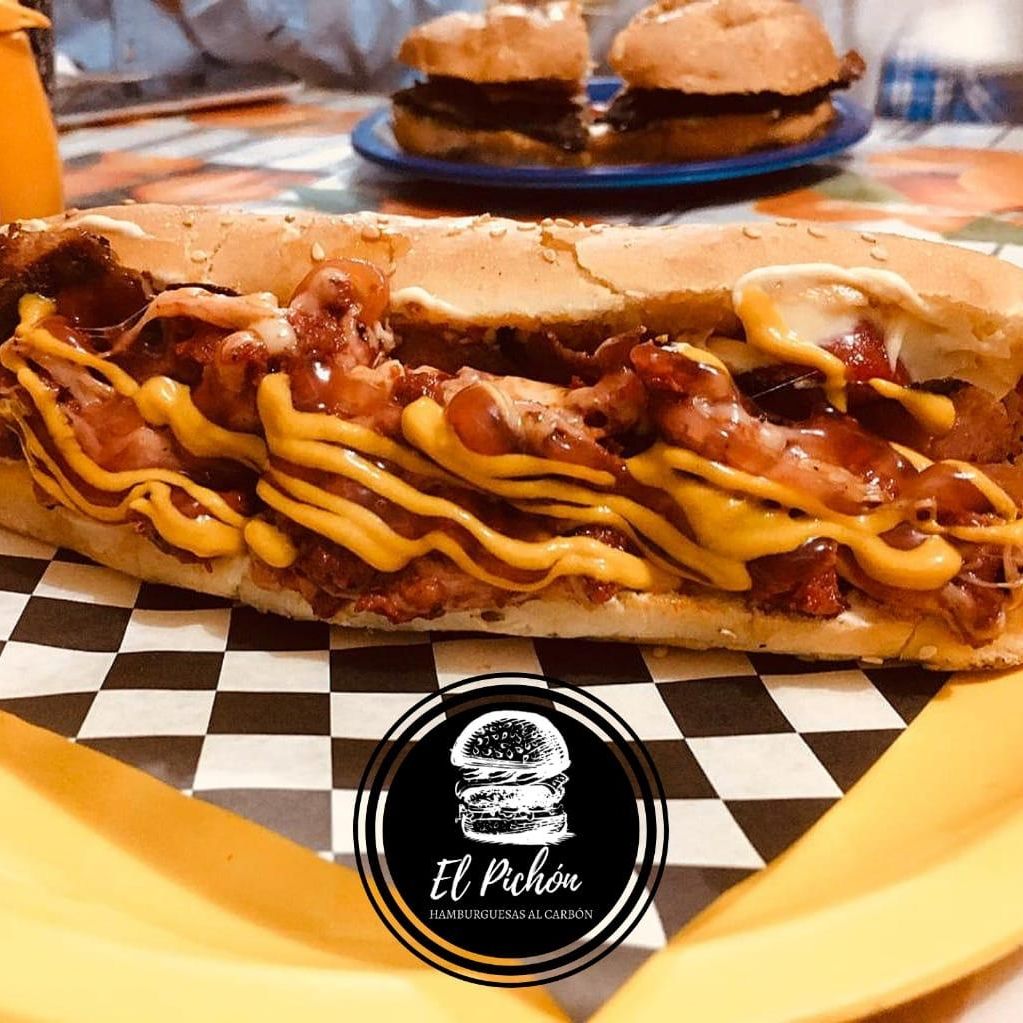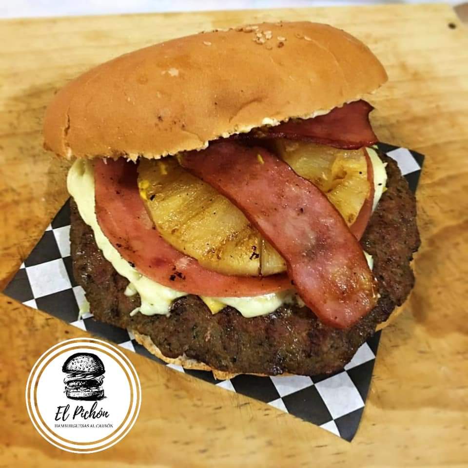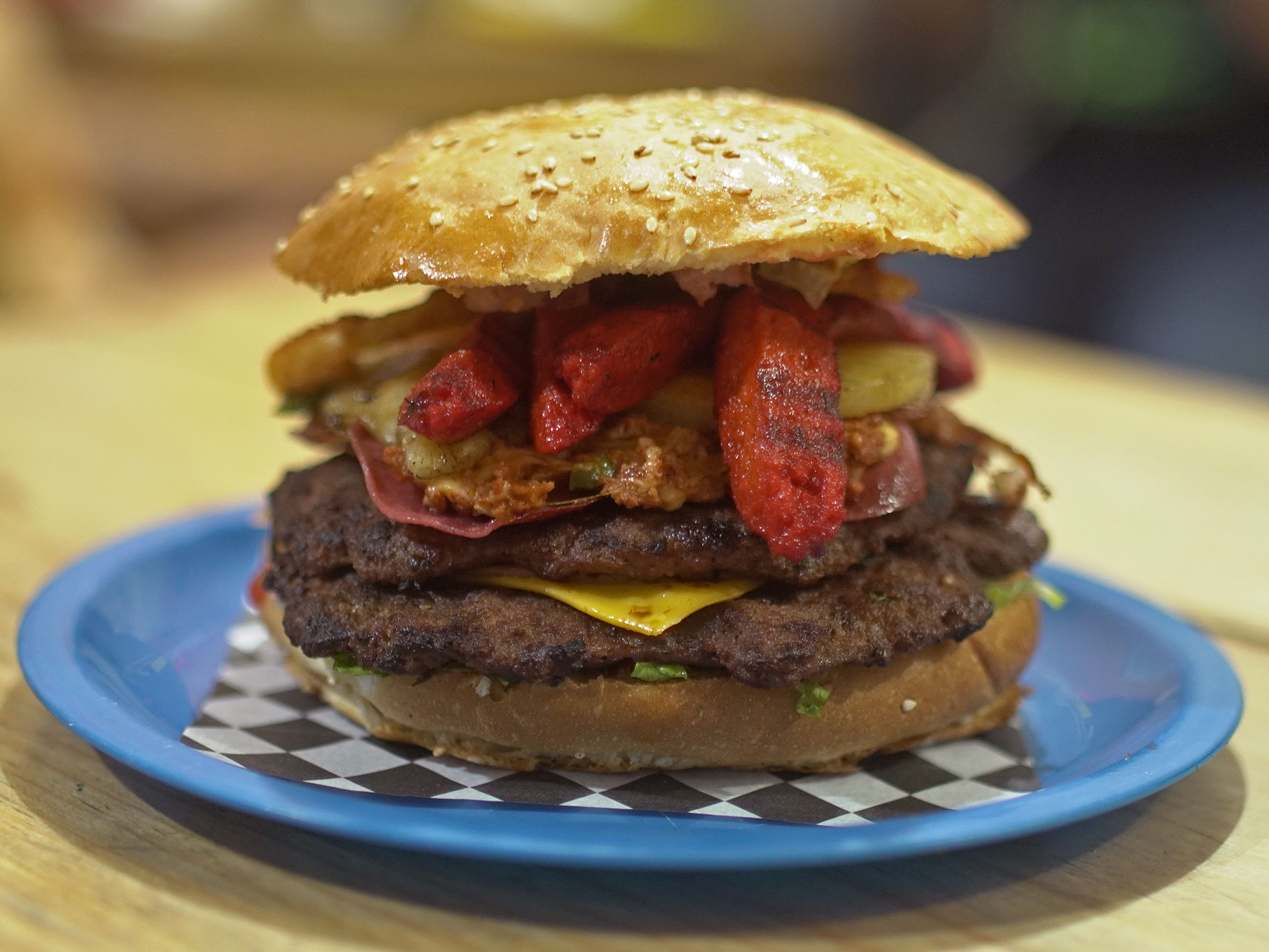 Pan brioche artesanal, lechuga, jitomate, cebolla cocida, pepinillos, chile de rajas, carne de sirloin, jamón, tocino y queso amarillo.