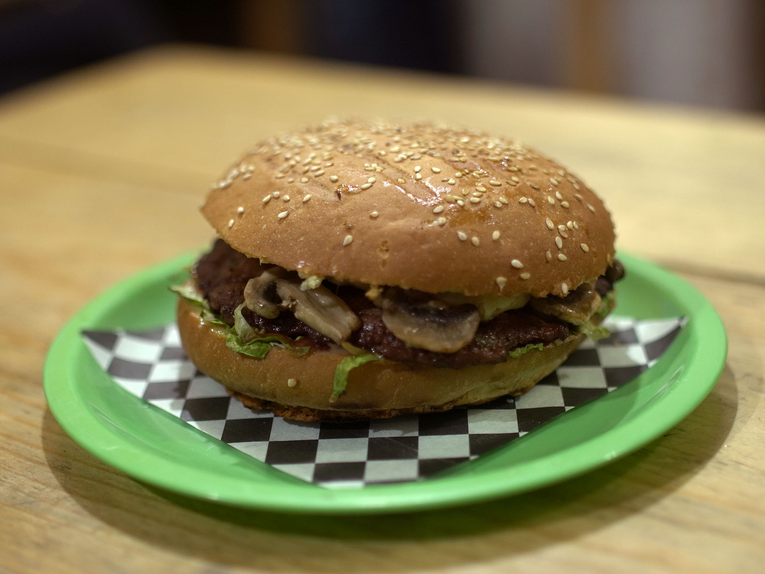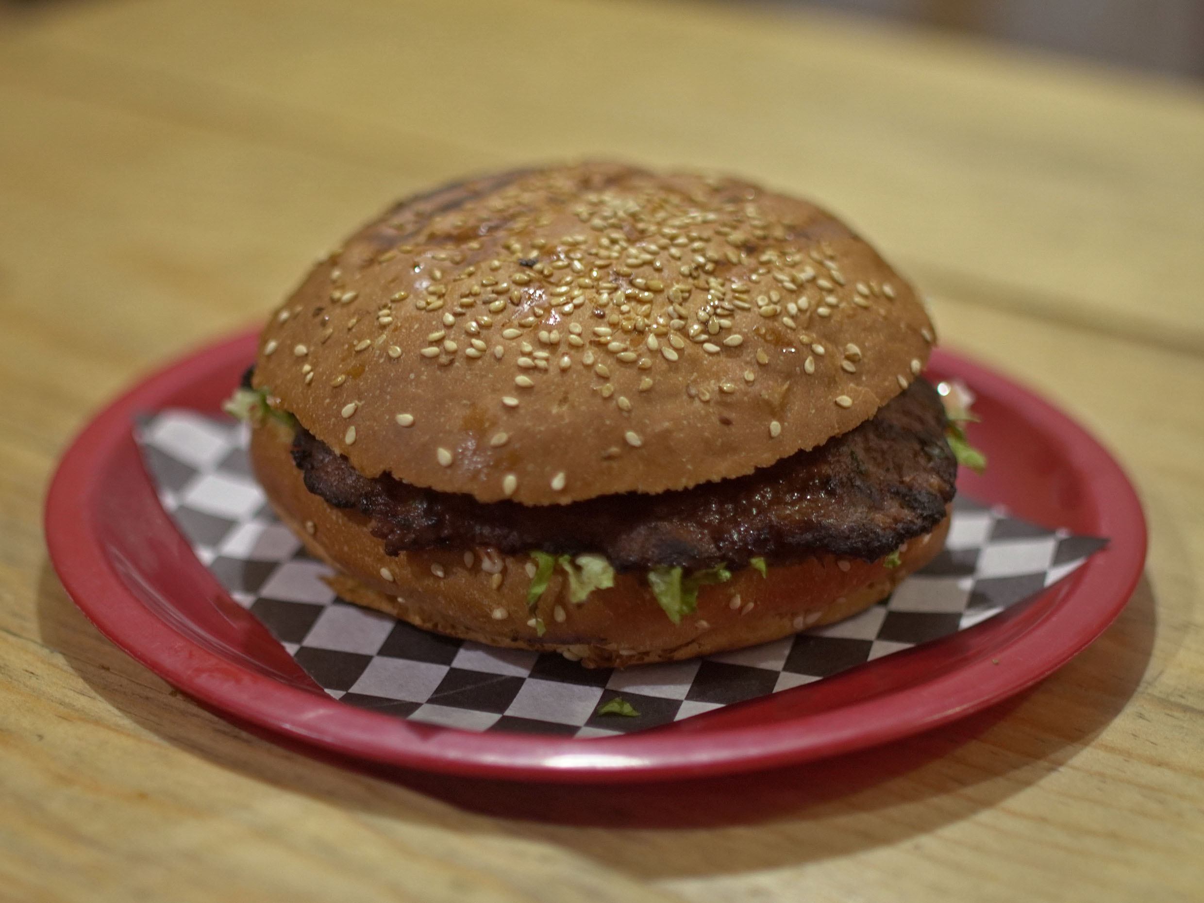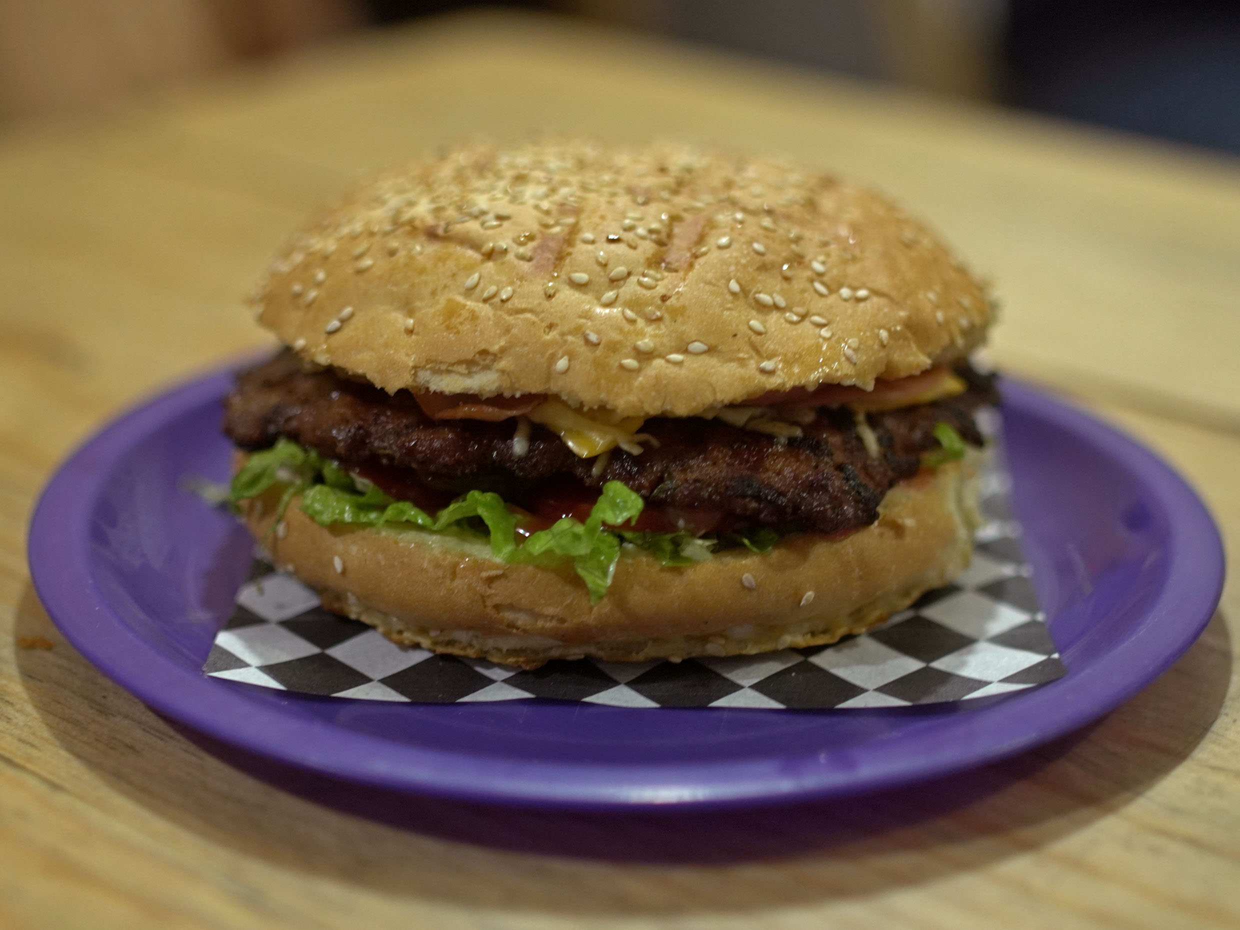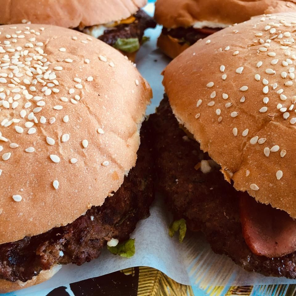 Pan brioche artesanal, lechuga, jitomate, cebolla cocida, pepinillos, chile de rajas, carne de sirloin, jamón, tocino y queso amarillo.