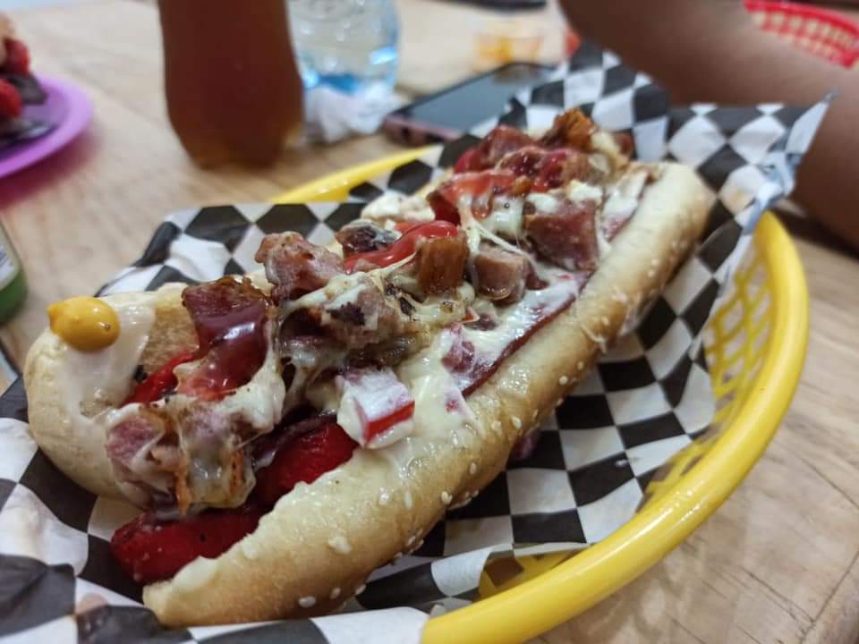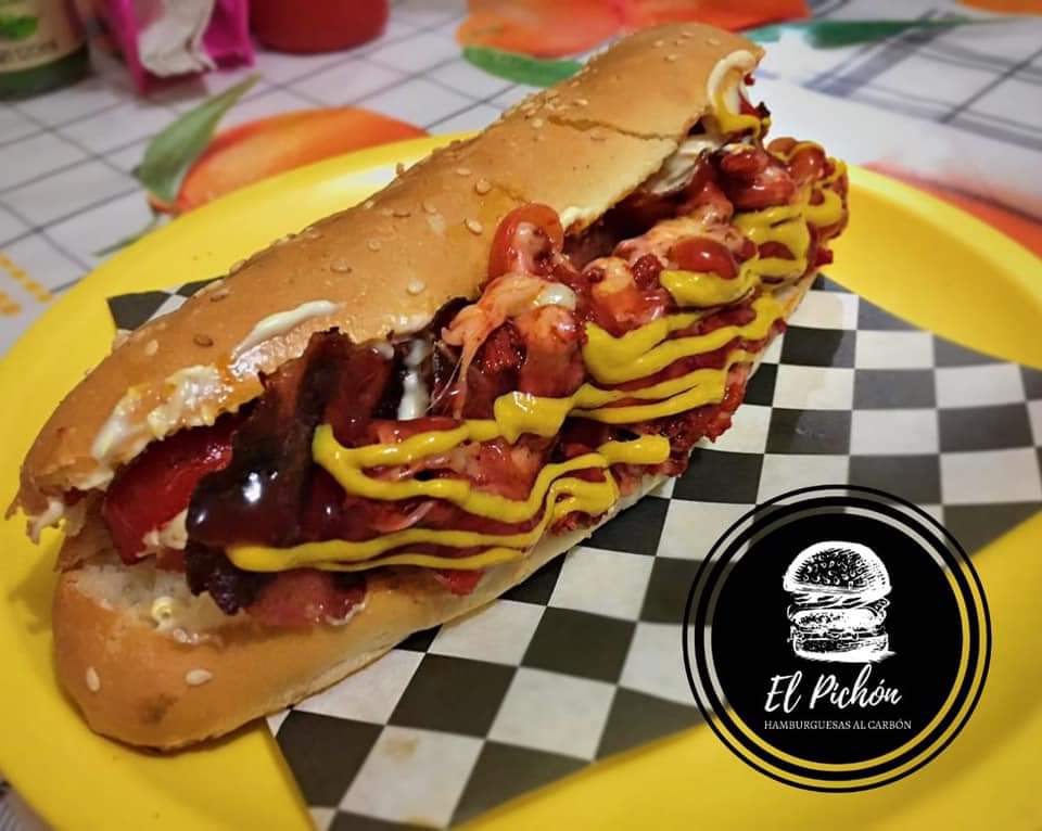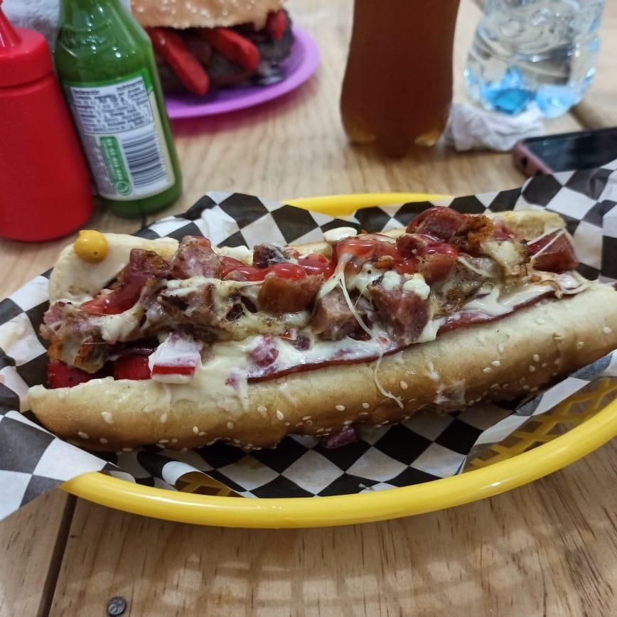 Doble salchicha campestre, tocino, queso asadero y chorizo argentino.