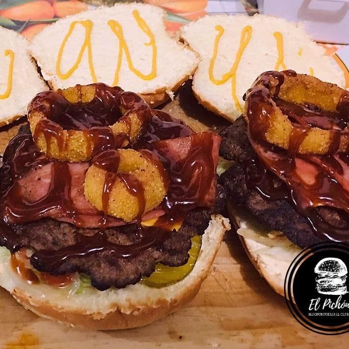 Base tradicional, aros de cebolla empanizados y salsa BBQ.
