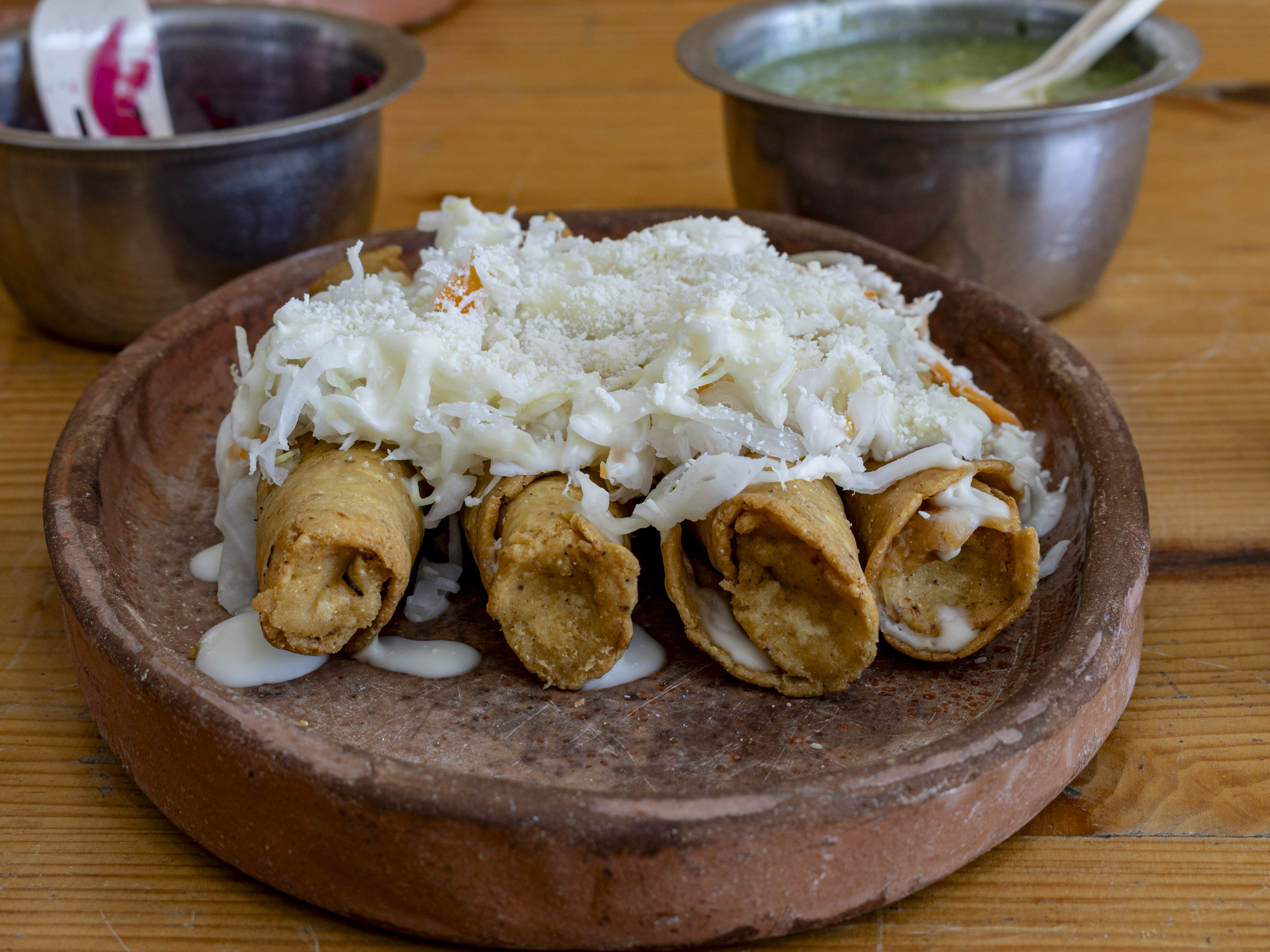 Orden de 4 tacos dorados, tortillas hechas a mano, 100% maíz, acompañado de repollo, salsa, queso y crema.