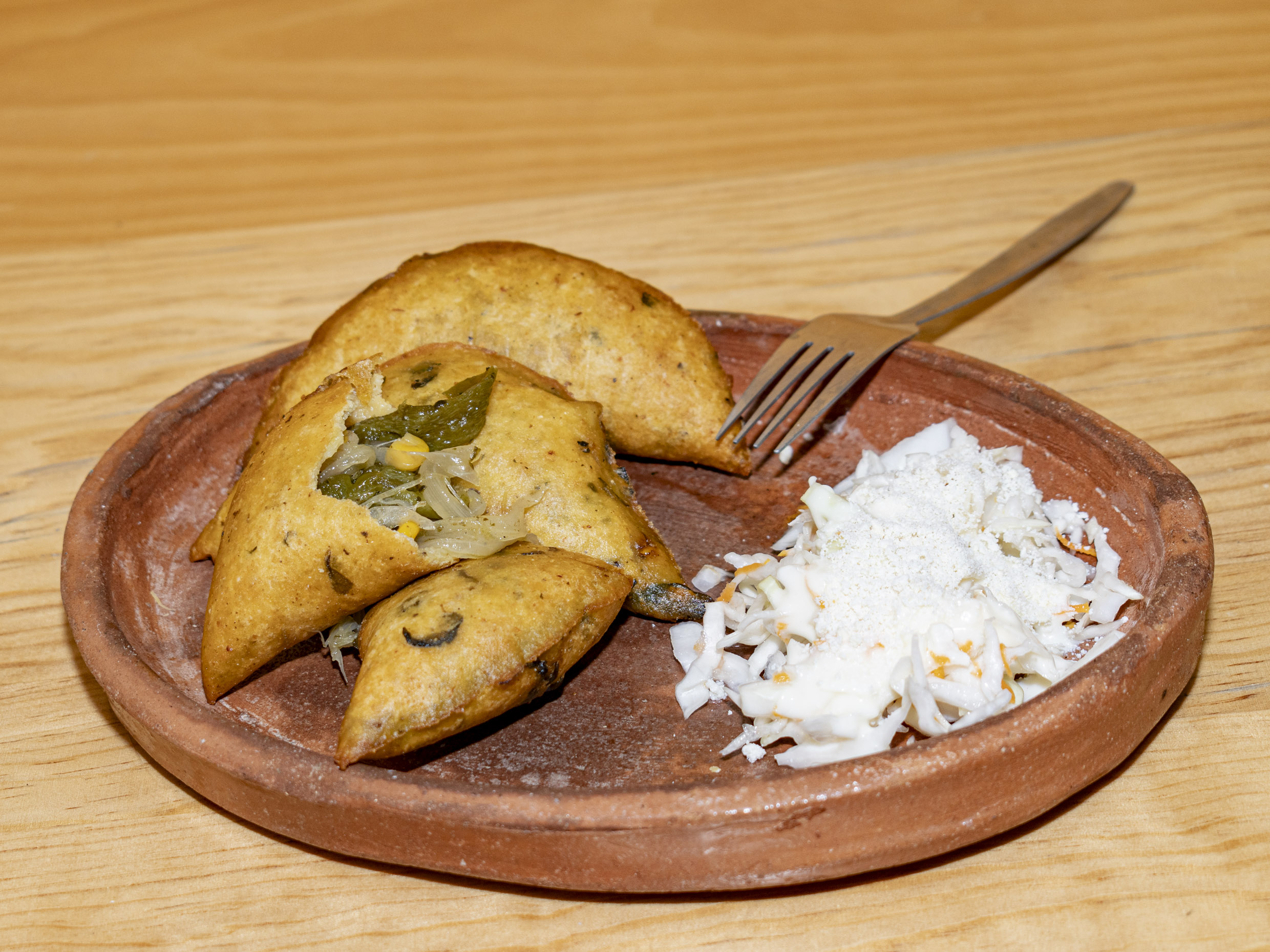 Platillo personal: orden de 3 empanadas de masa 100% maíz con chipilín, acompañadas de repollo, salsa, queso y crema por aparte.