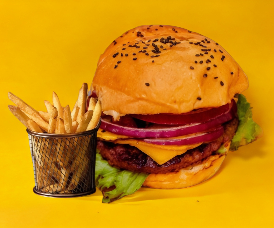 Pan brioche, carne a la parrilla, queso, vegetales (lechuga, jitomate, cebolla) y aderezo , incluye papas fritas