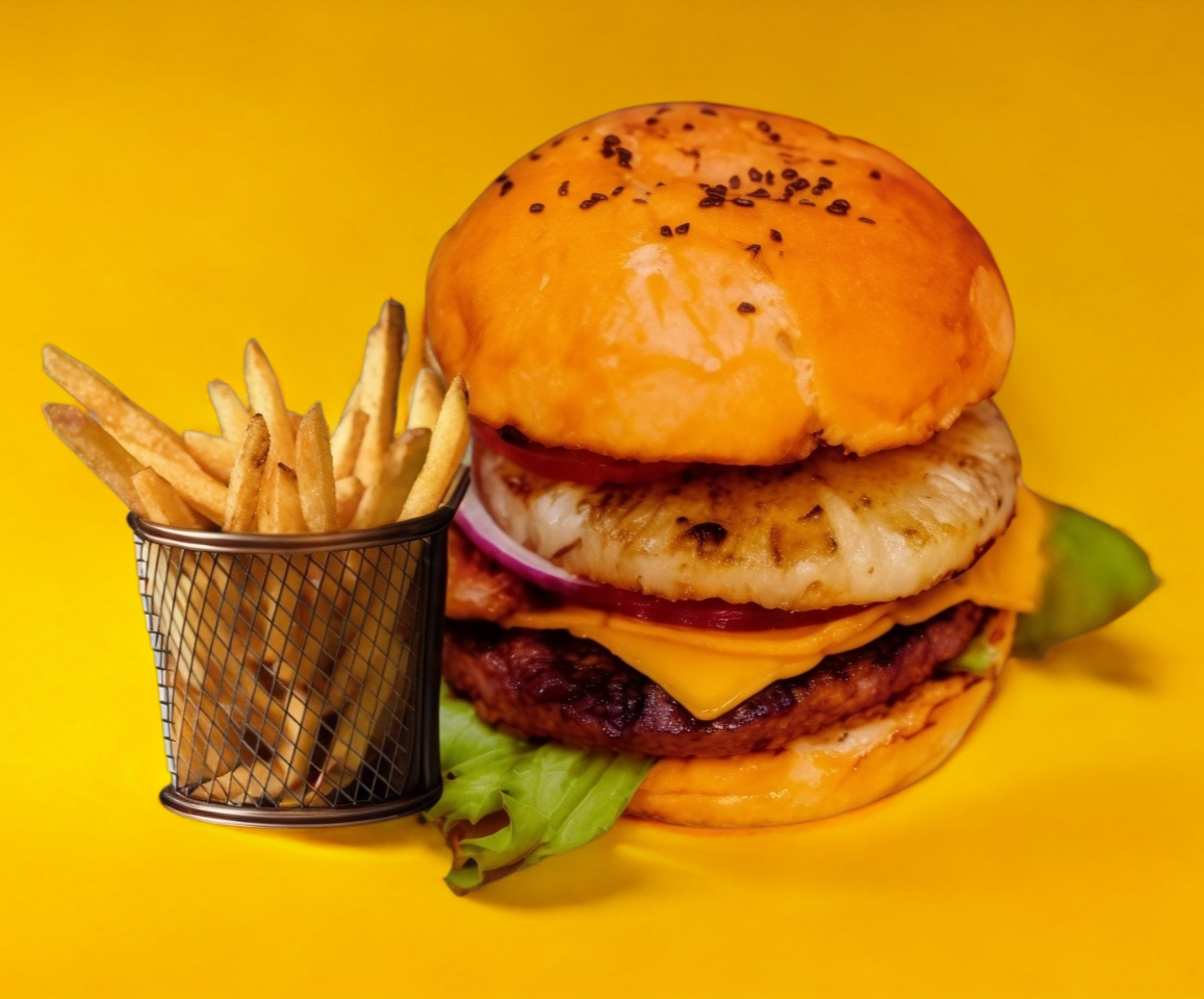 Pan brioche, carne a la parrilla , queso, piña, jamón y vegetales (lechuga, jitomate, cebolla) y aderezo. incluye papas fritas