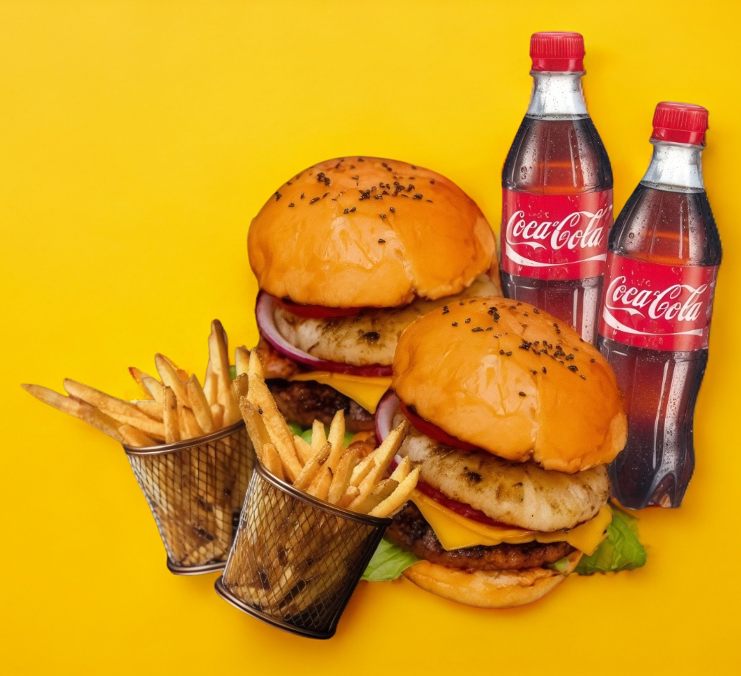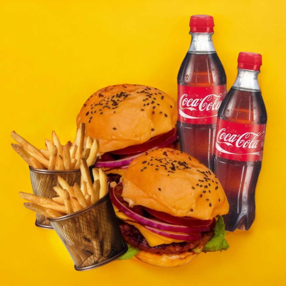 2 Hamburguesas clásicas más 2 Coca Colas o agua del día.incluye papas fritas