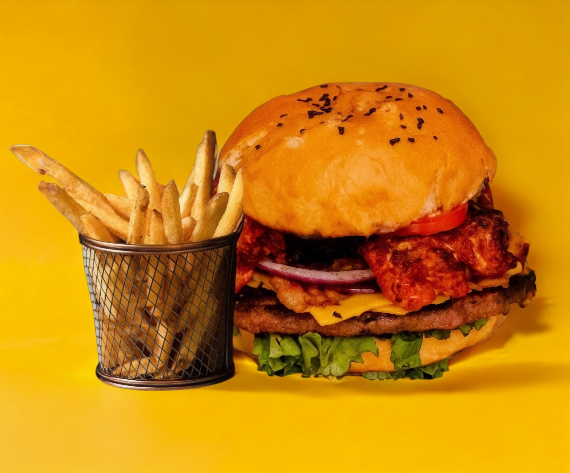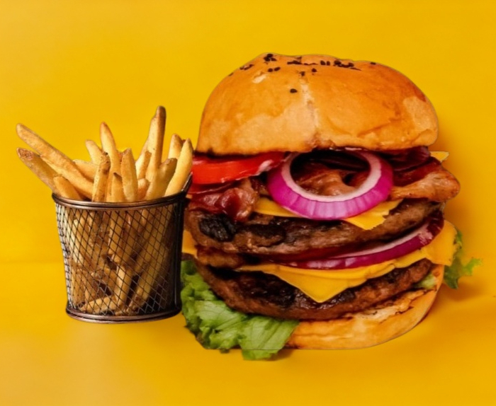 Pan brioche, doble carne a la parrilla , doble queso, tocino y vegetales (lechuga, jitomate, cebolla) y aderezo.incluye papas fritas
