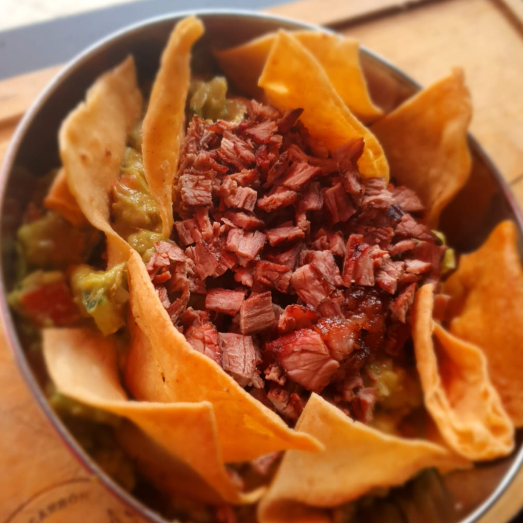 Guacamole con arrachera en porción de 1/2 Litro.