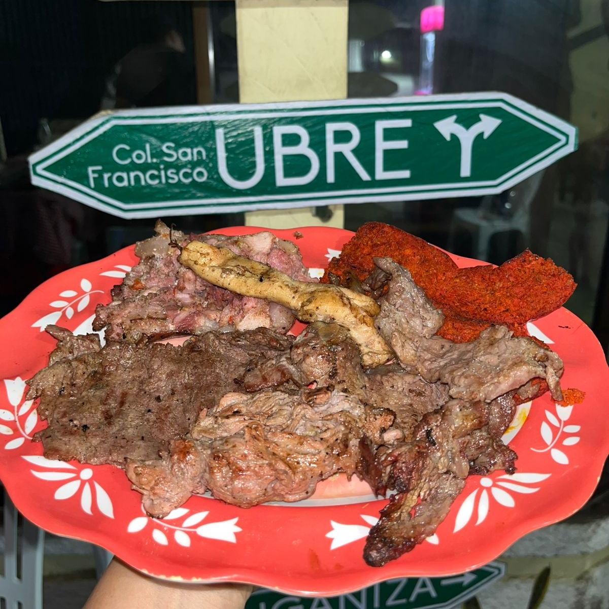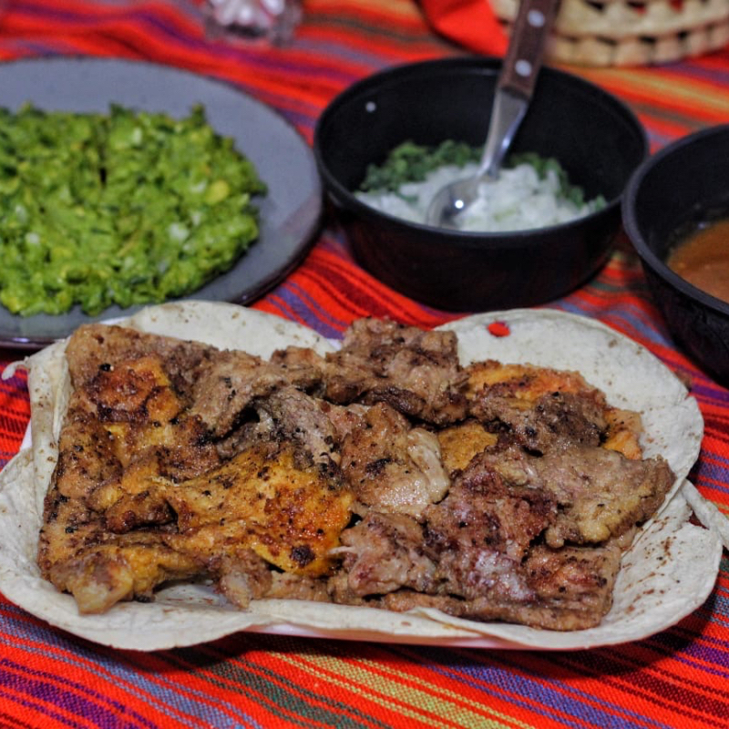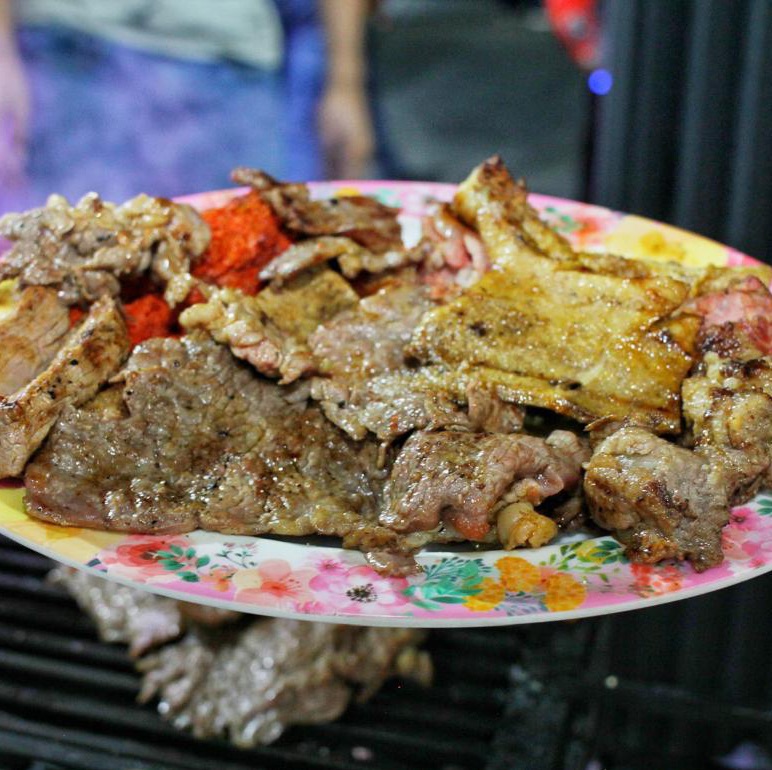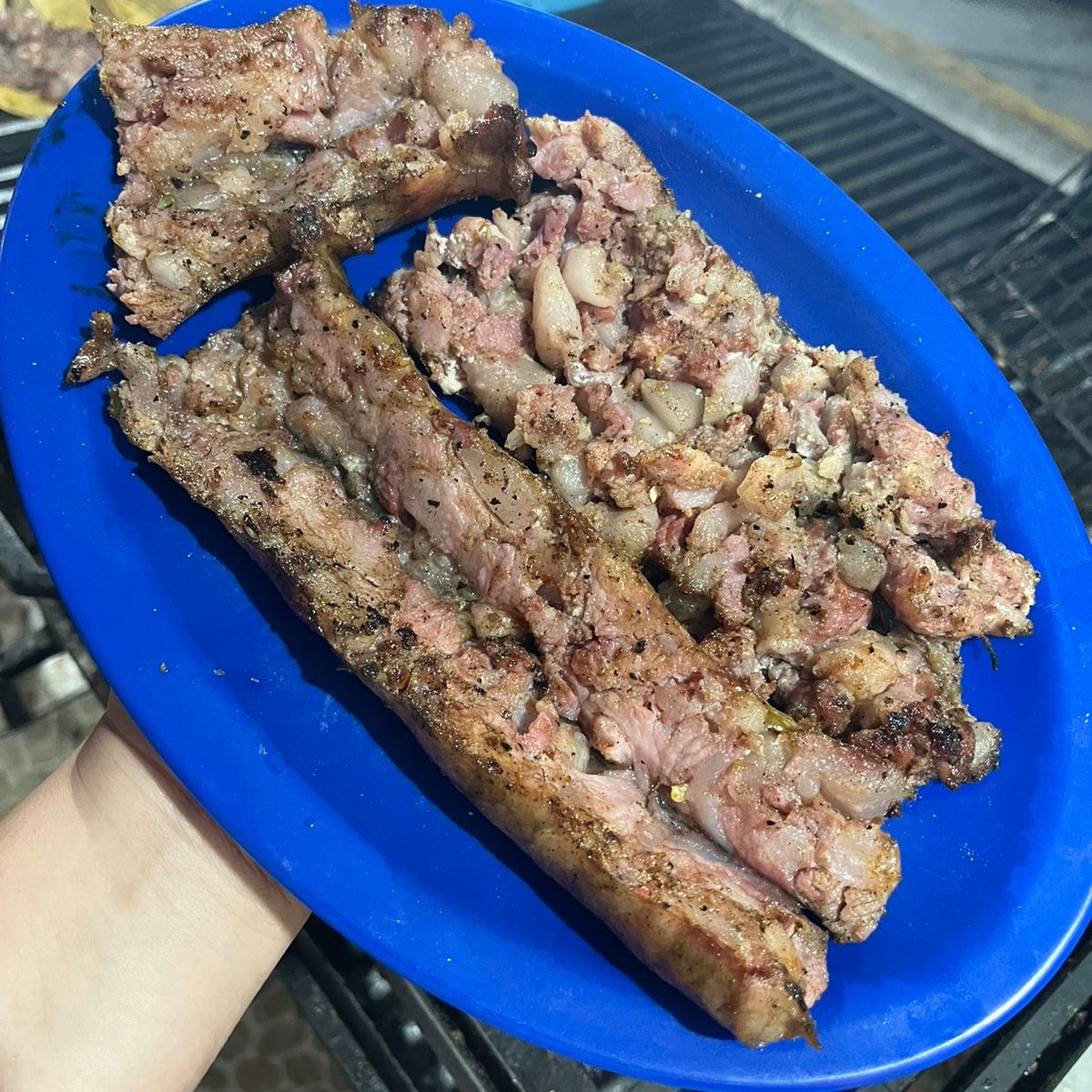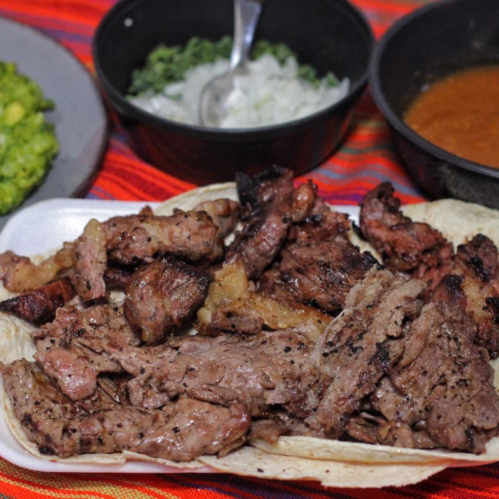 Orden completa de carne surtida, asada, ubre, chorizo, longaniza y tripa.