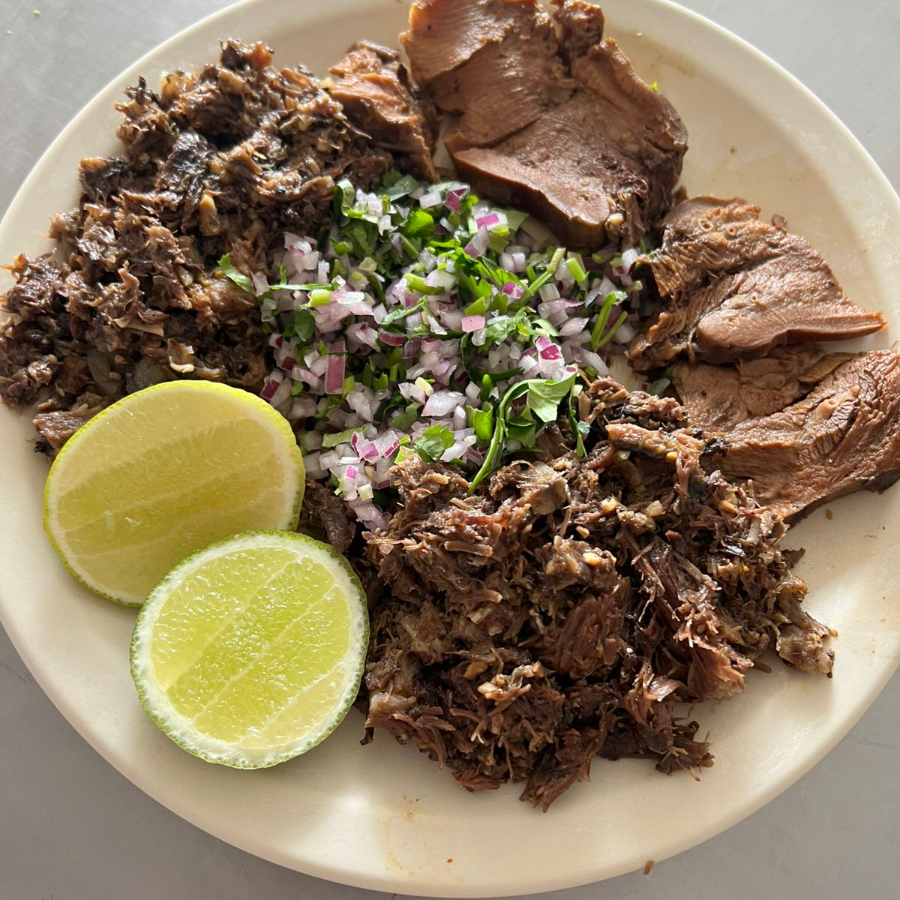 1/2 kg de Carne de Res surtido, acompañado con tortillas, salsa, limón, cebolla y cilantro.
