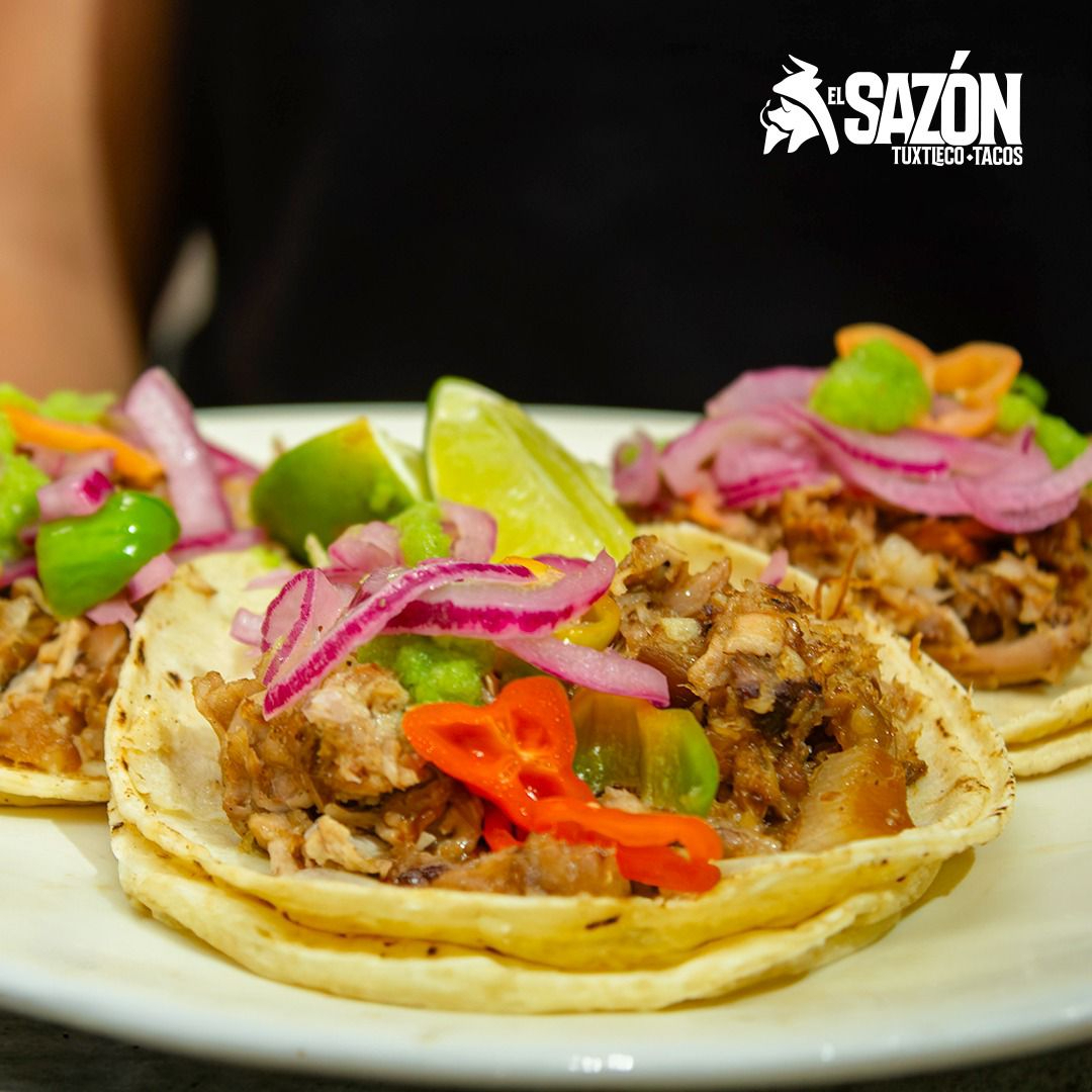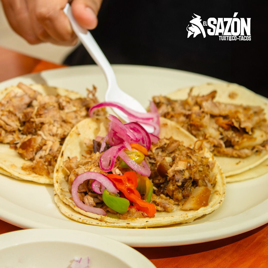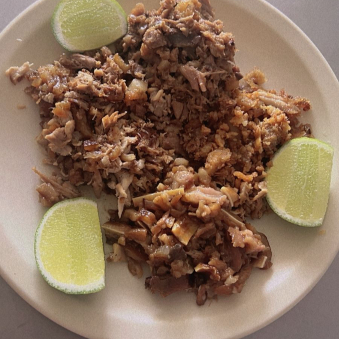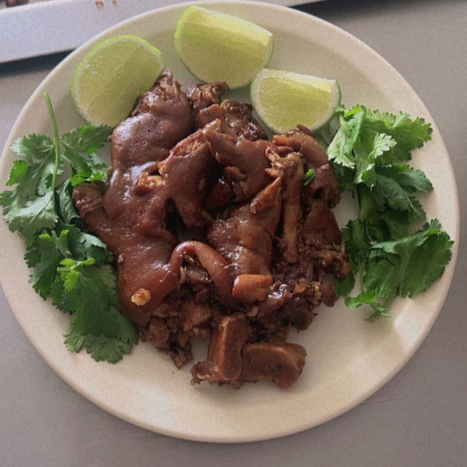 Pata de puerco cocida con manteca y calentada al vapor, acompañado de tortillas, salsa, limón, cebolla y cilantro.