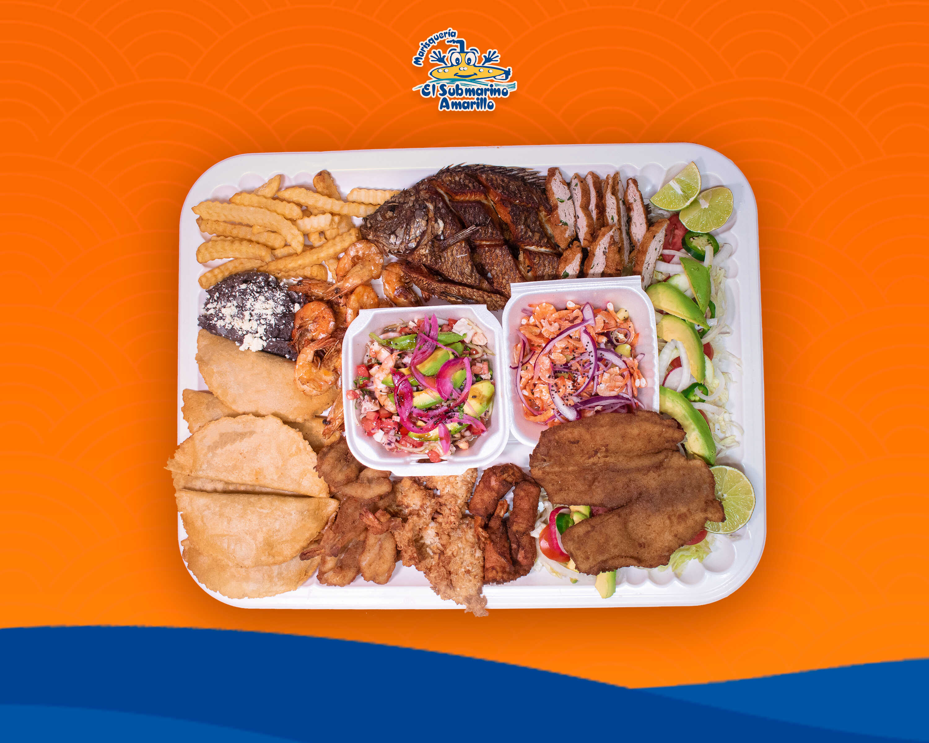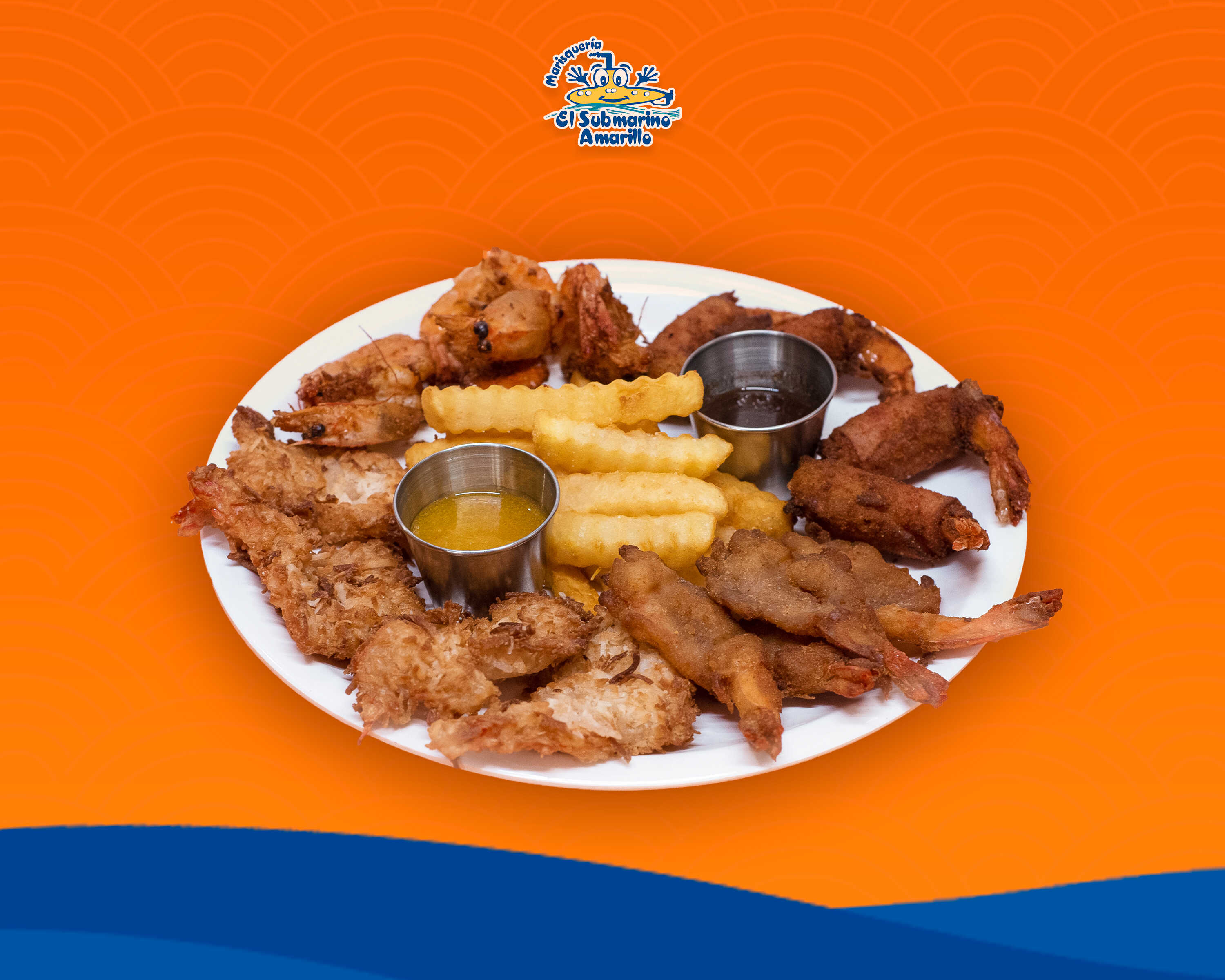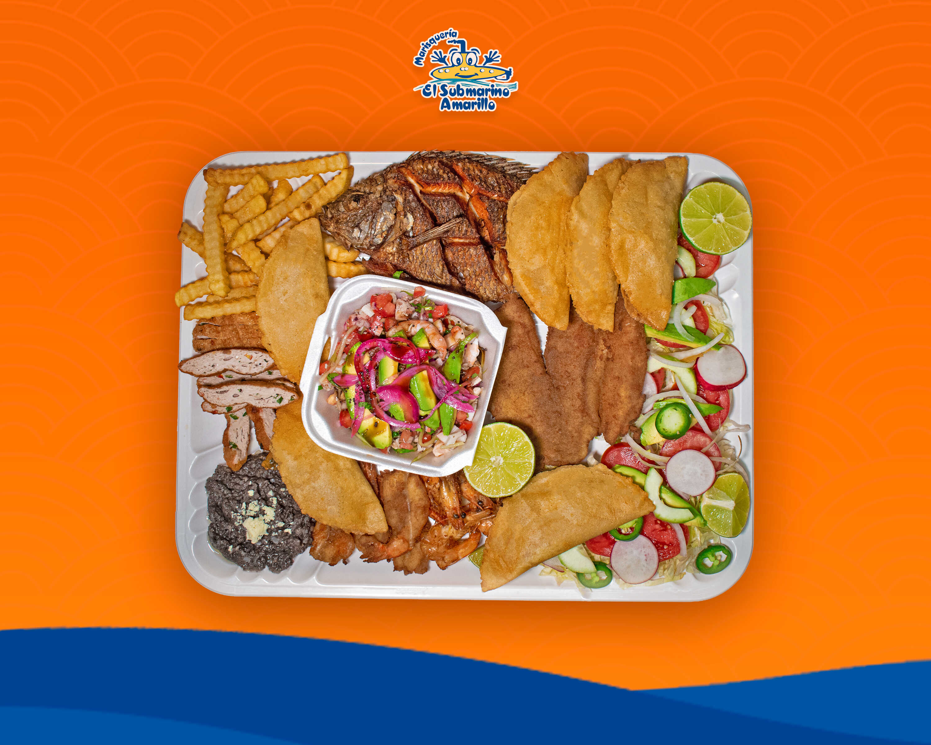 Incluye una orden completa de cada tipo de camarones, filete empanizado, 6 empanadas (camarón y cazón), 2 órdenes de macabil, hueva frita, mojarra frita, y ensalada chica al aguachile.