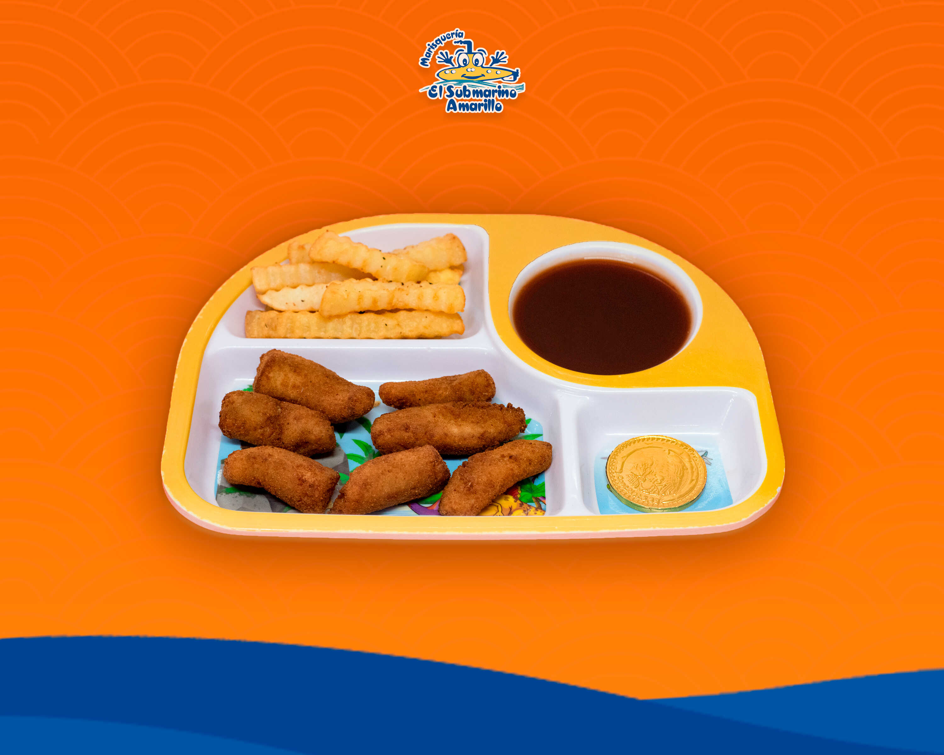 Filetes de pescado fresco empanizados, con papas a la francesa, huevito Kinder y jugo.