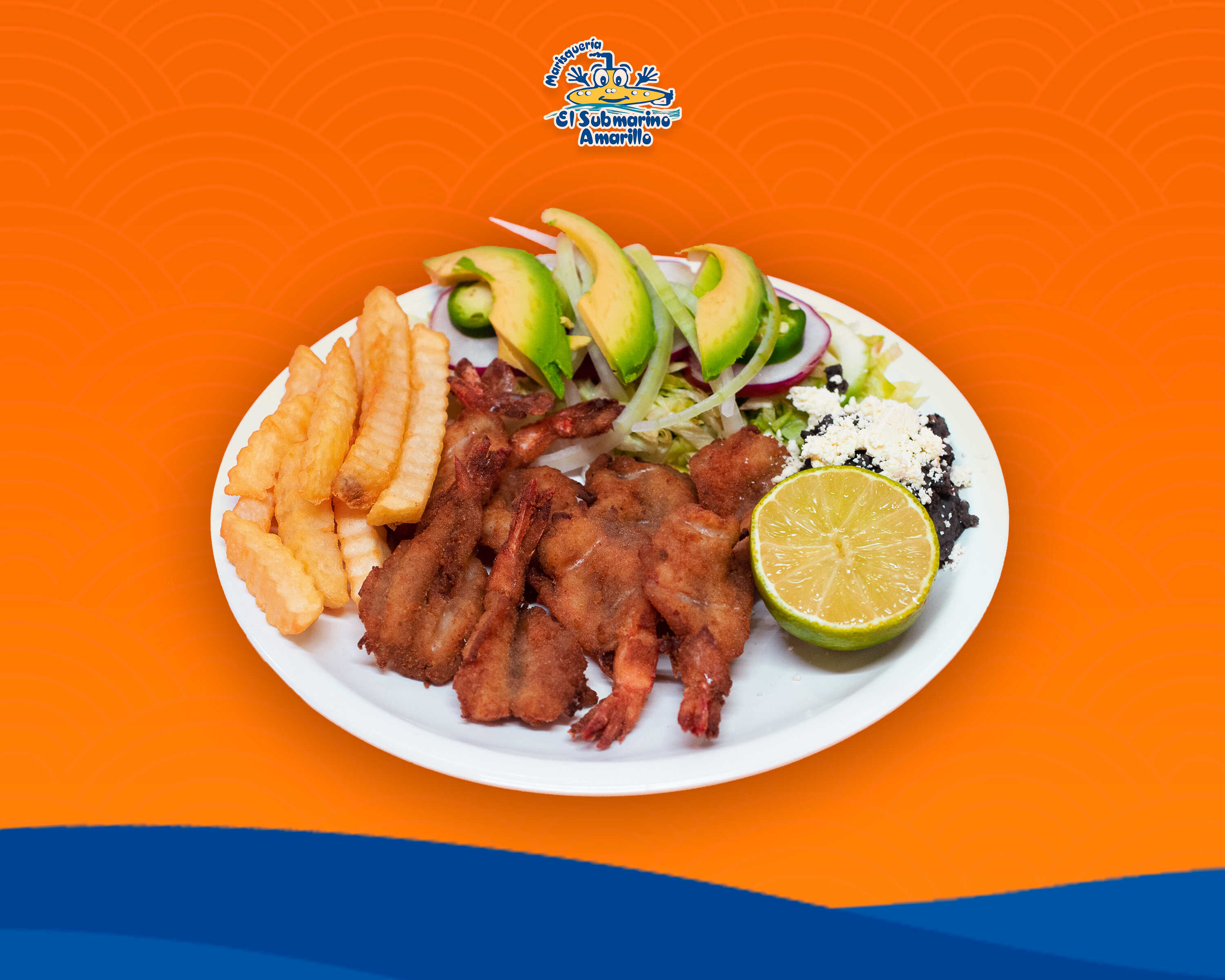 Camarones empanizados al estilo de la casa, servidos con ensalada, frijoles refritos y papas a la francesa.