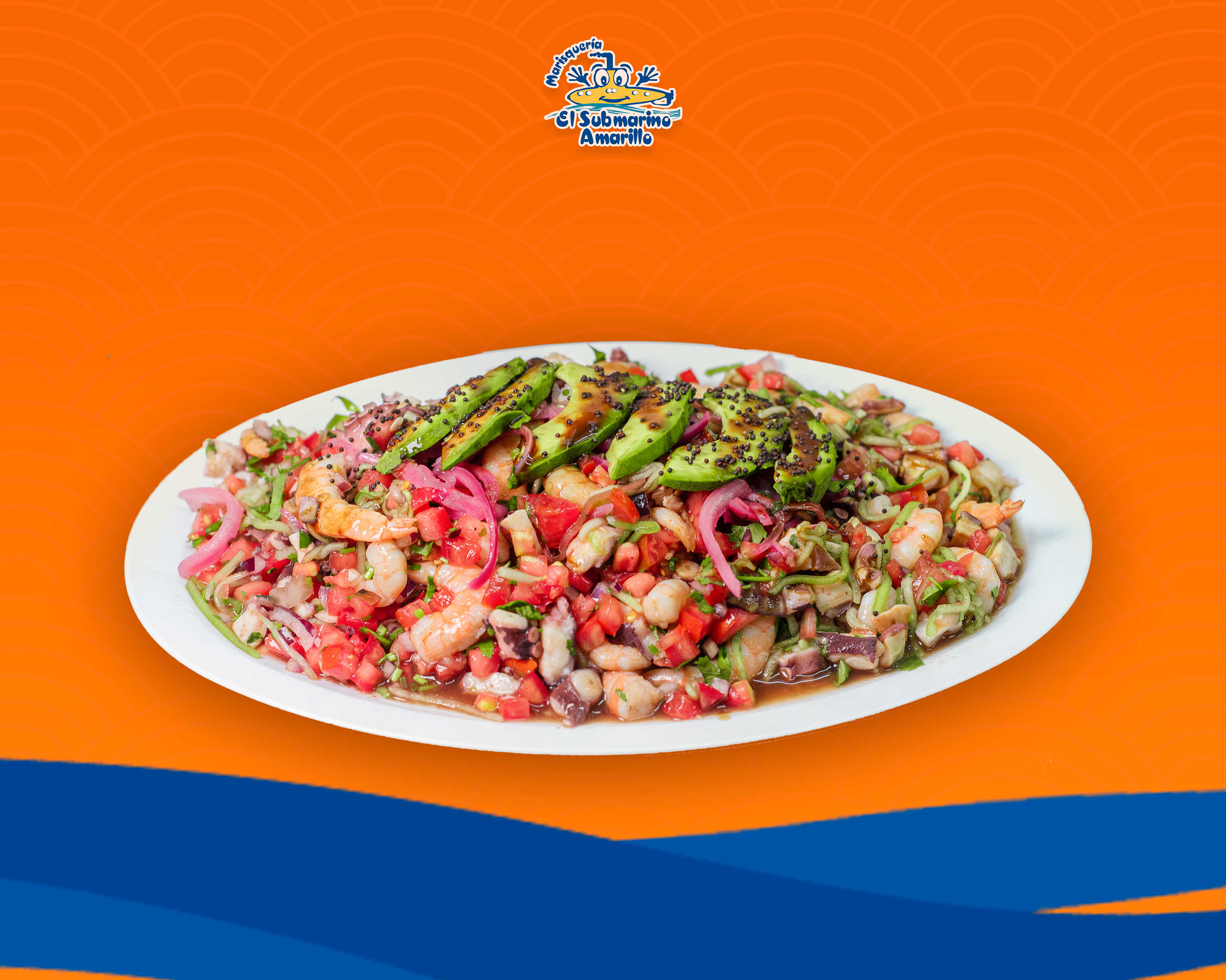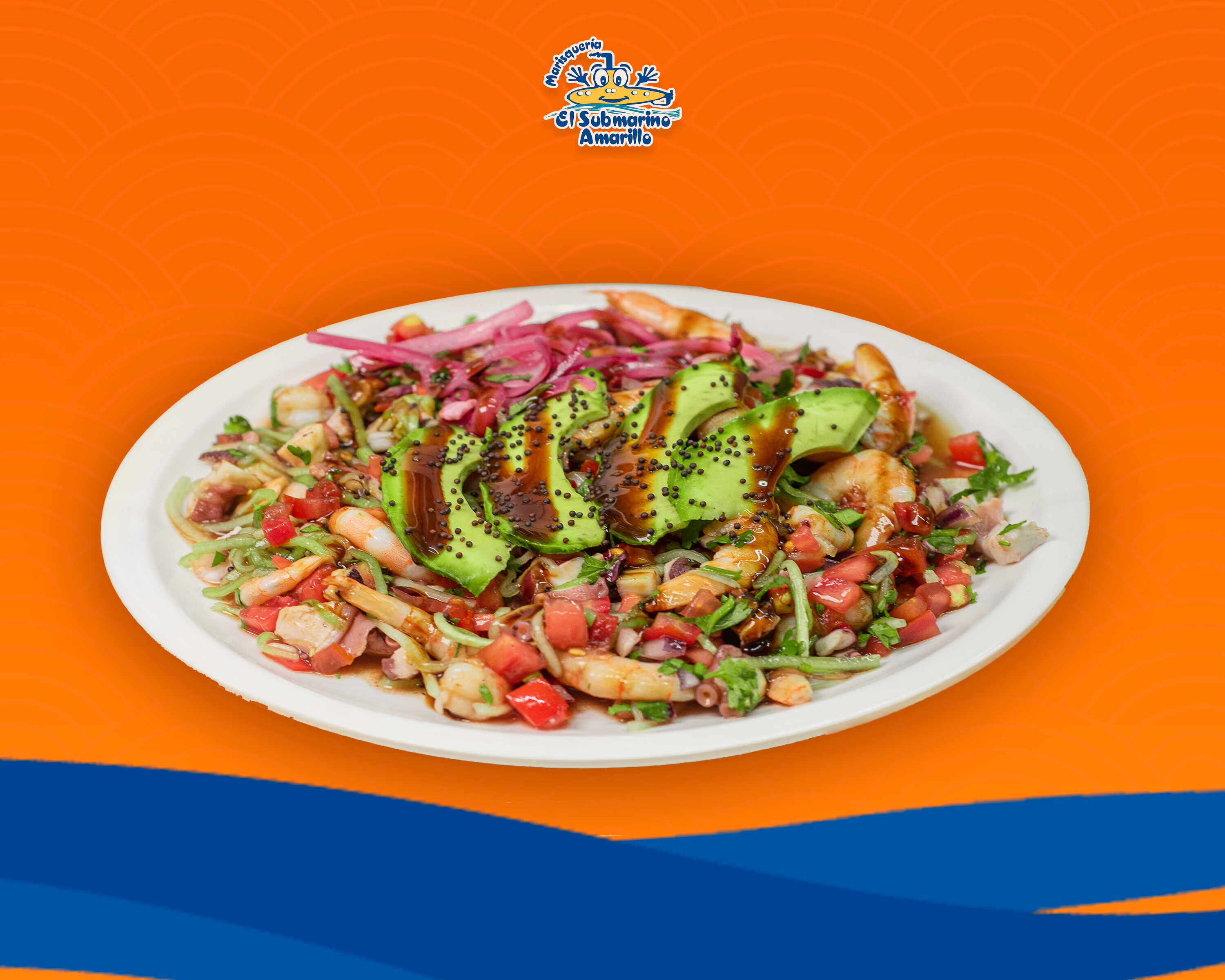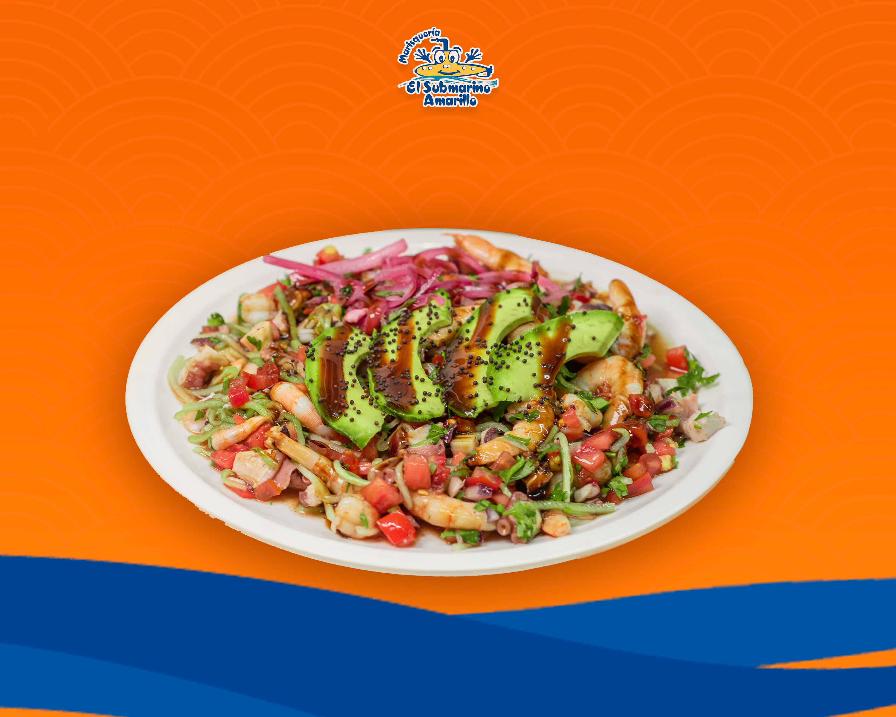 Ensalada para compartir (3-4 personas) con mariscos al estilo el submarino amarillo.