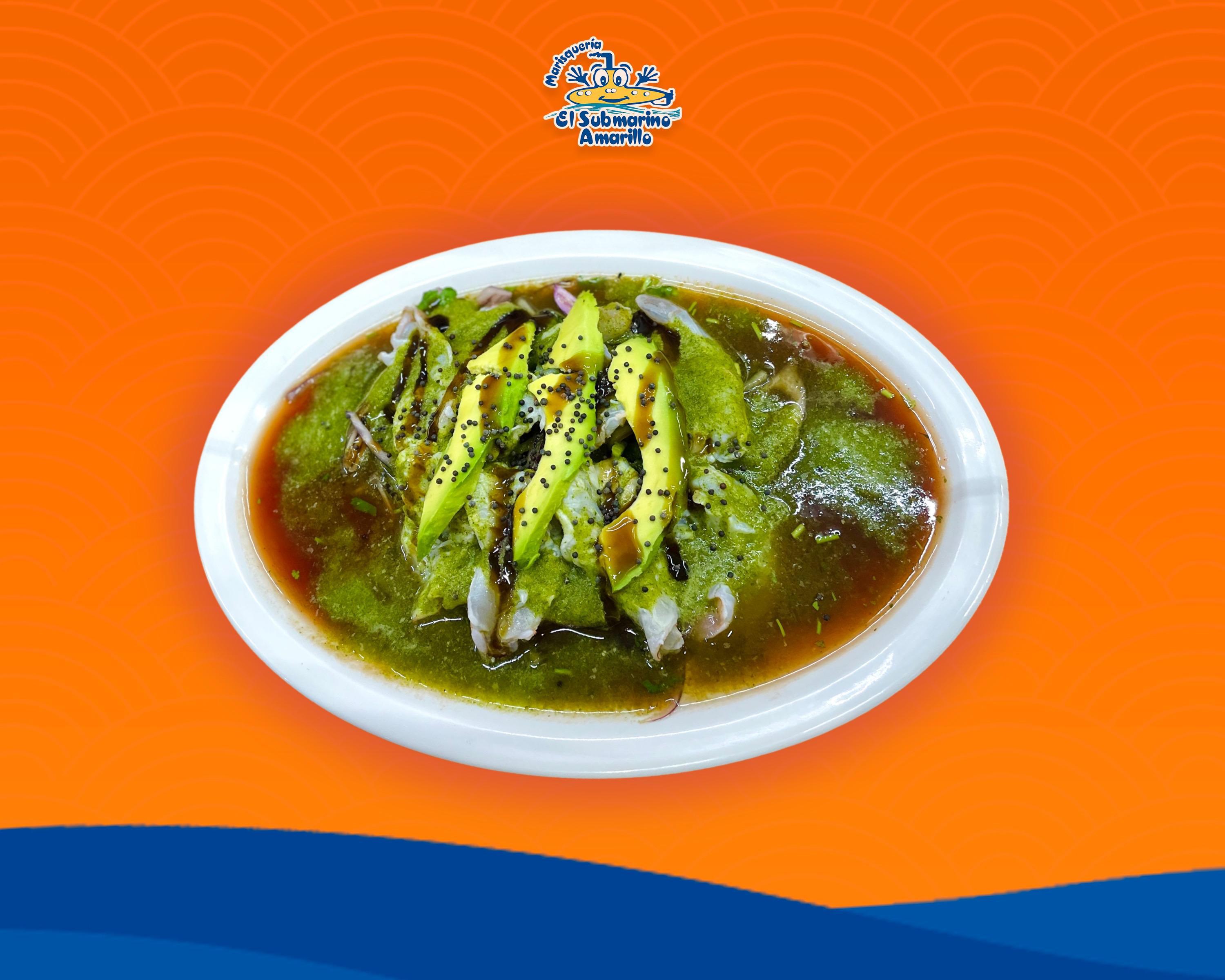 Camarones frescos en corte mariposa, marinados en salsa de aguachile verde con limón, chile fresco y especias, acompañados de aguacate.
