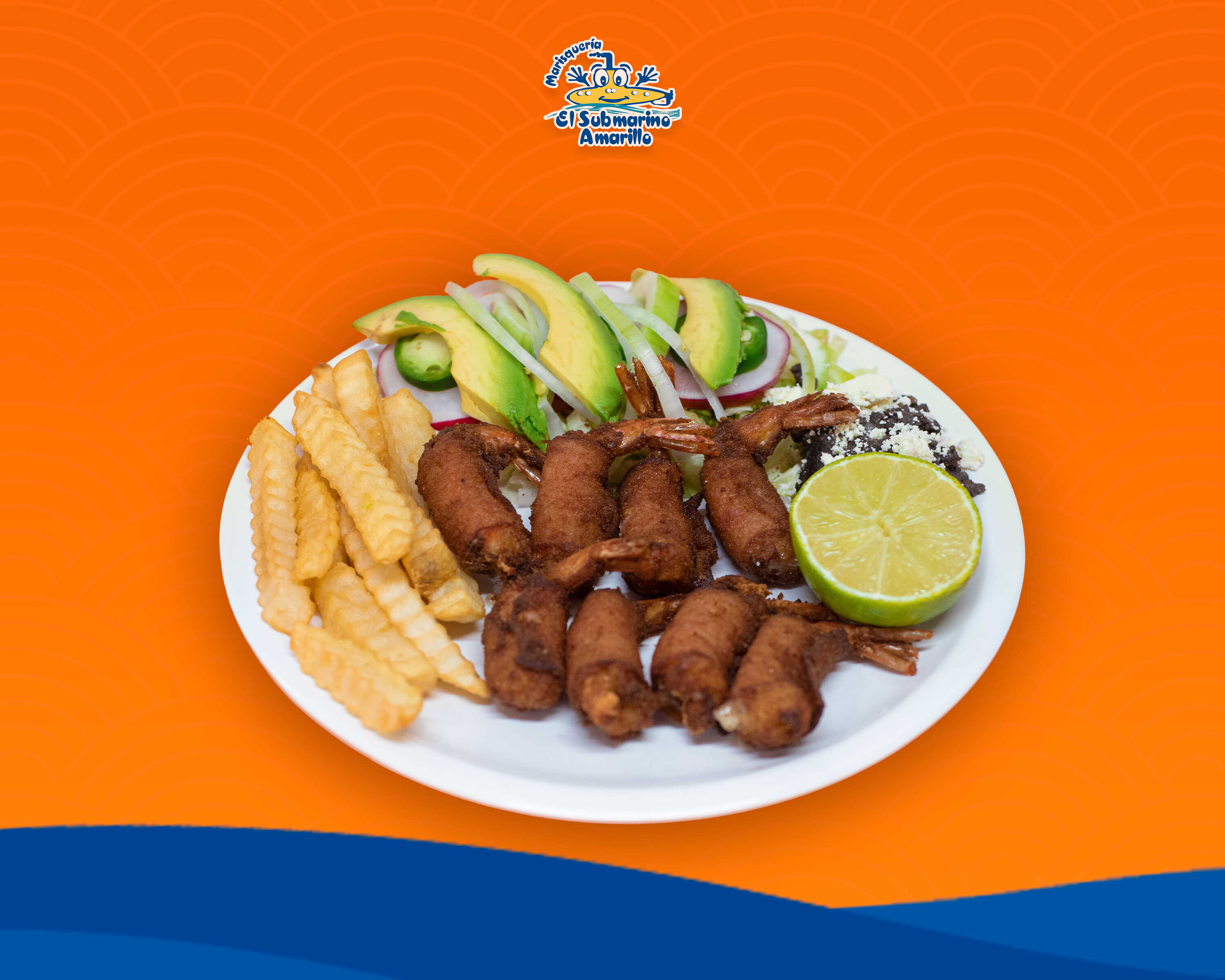 Orden con 4 camarones empanizados, 4 al coco, 4 al mojo de ajo y 4 a la momia; acompañados de papas a la francesa y aderezos de tamarindo y mango.
