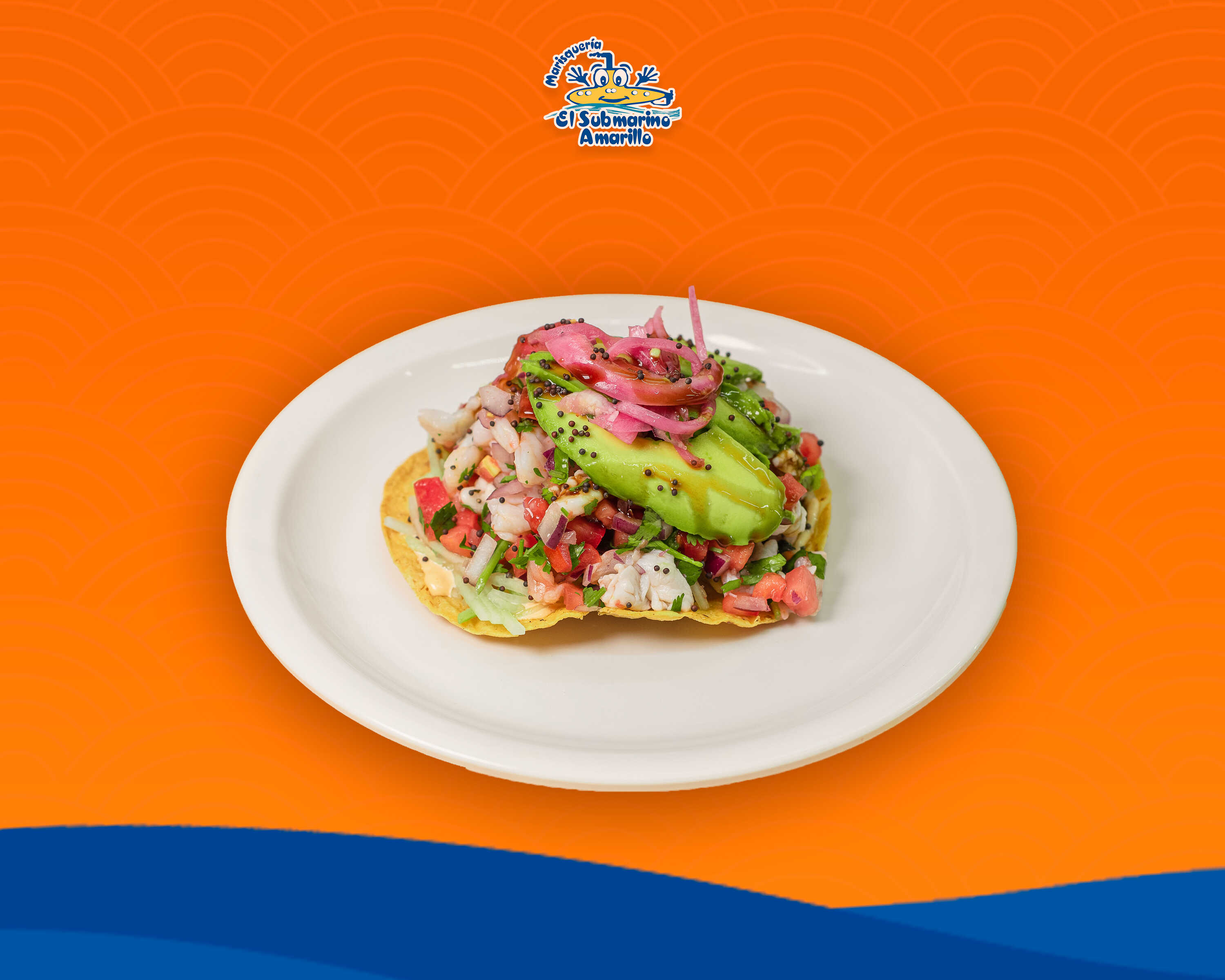 Tostada con mariscos, pepino, cebolla curtida, cilantro, tomate, aguacate y salsas de la casa.