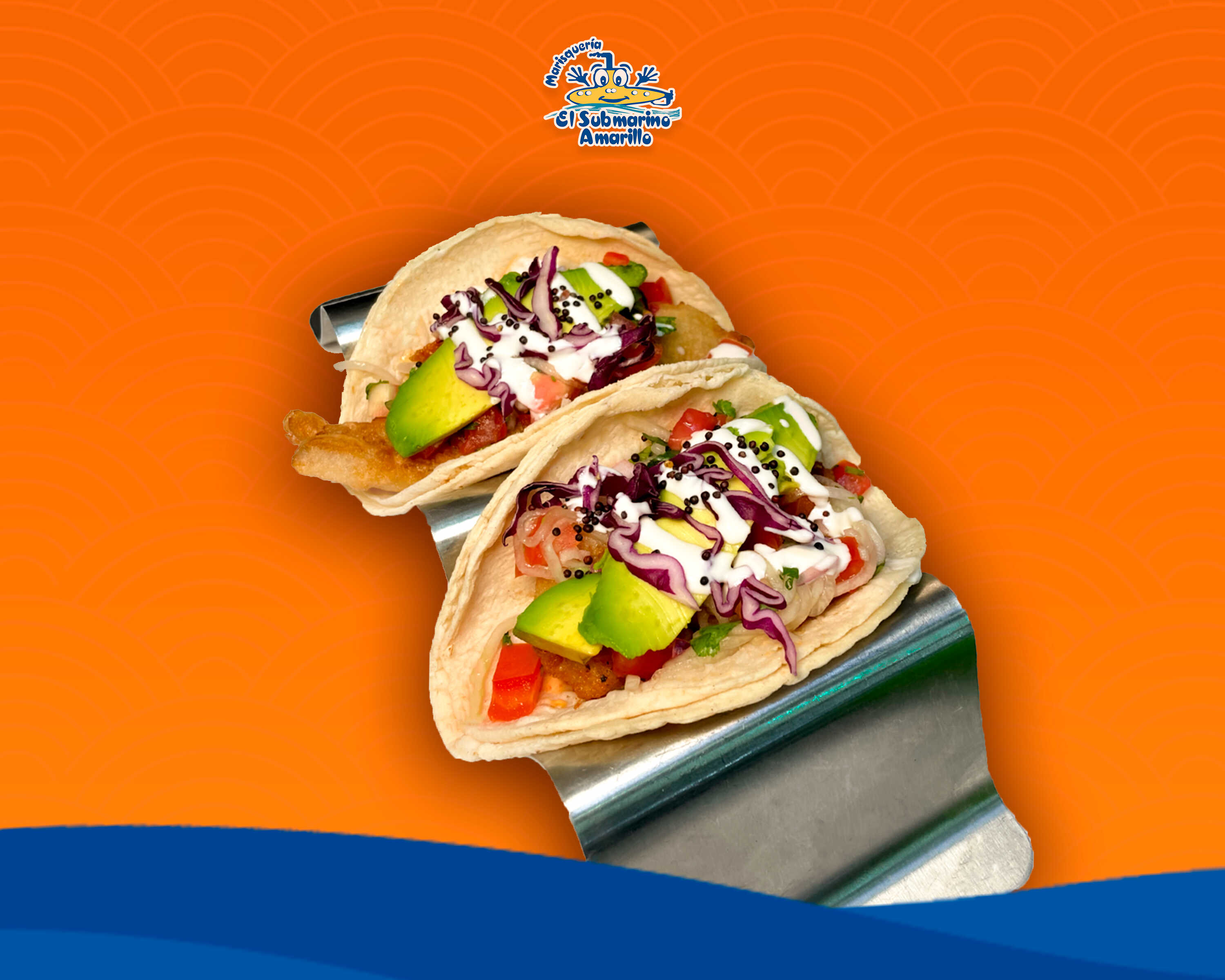Taco de pescado capeado con receta especial, acompañado de cebolla morada curtida y pico de gallo.