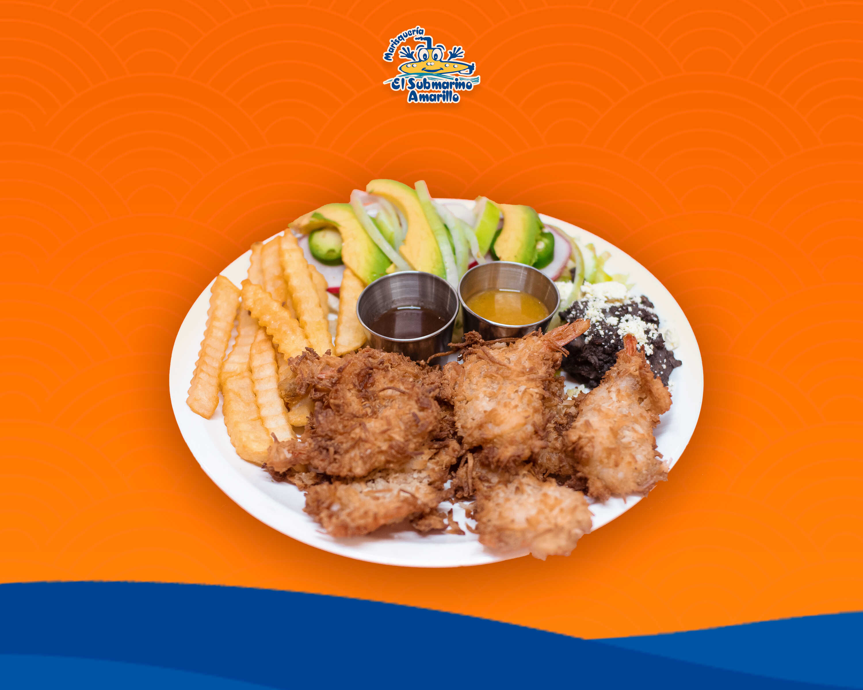 Camarones empanizados con coco fresco, servidos con ensalada, frijoles refritos y papas a la francesa.