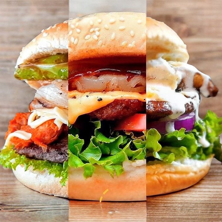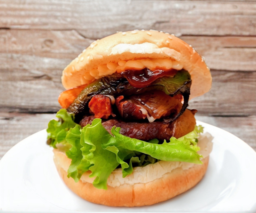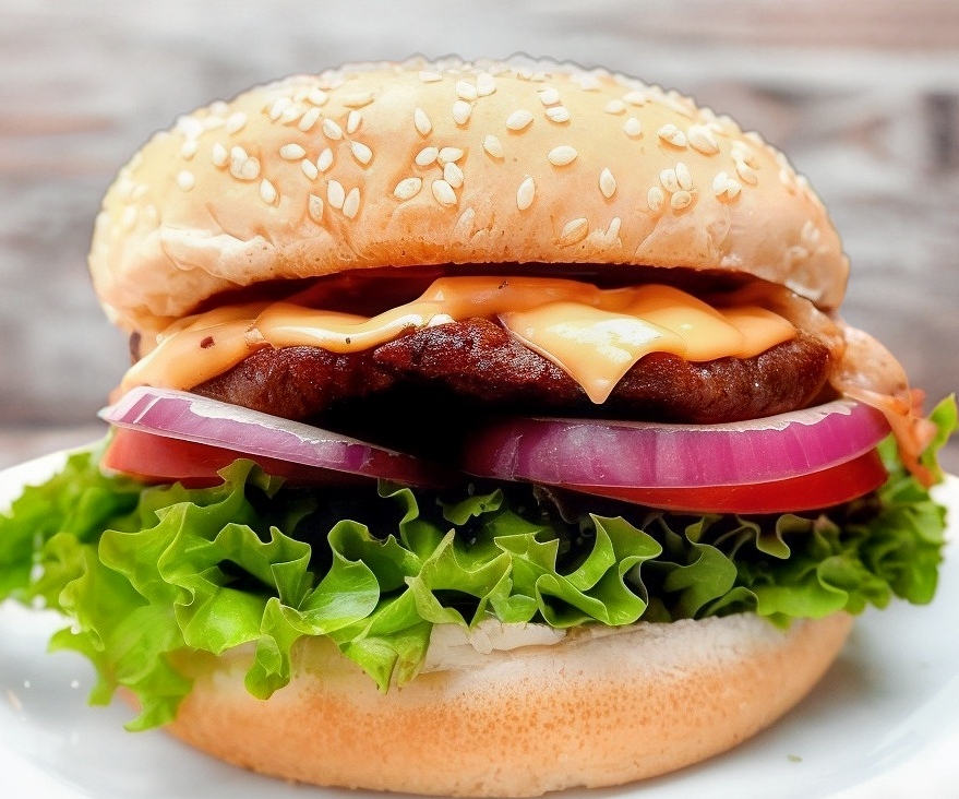 carne de res, tocino , queso amarillo, lechuga, tomate y cebolla.