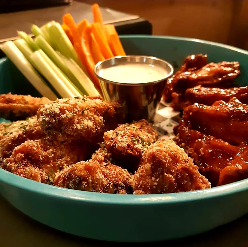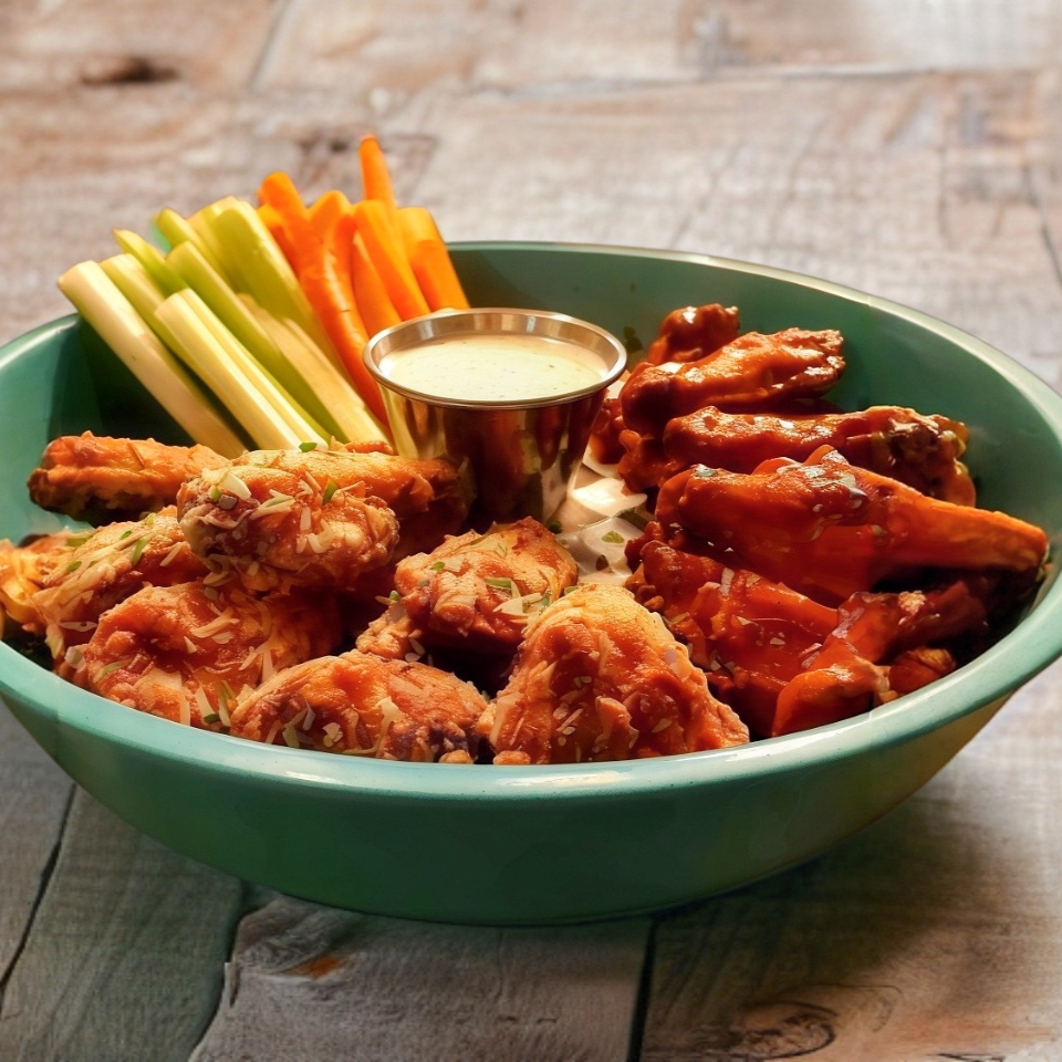 Alitas 10 piezas o Boneless 265 gr(depende del tamaño las piezas) Selecciona hasta dos salsas . Incluye aderezo ranch 40 gramos y vegetales (Apio y zanahoria) 100 gramos. (Personal)
