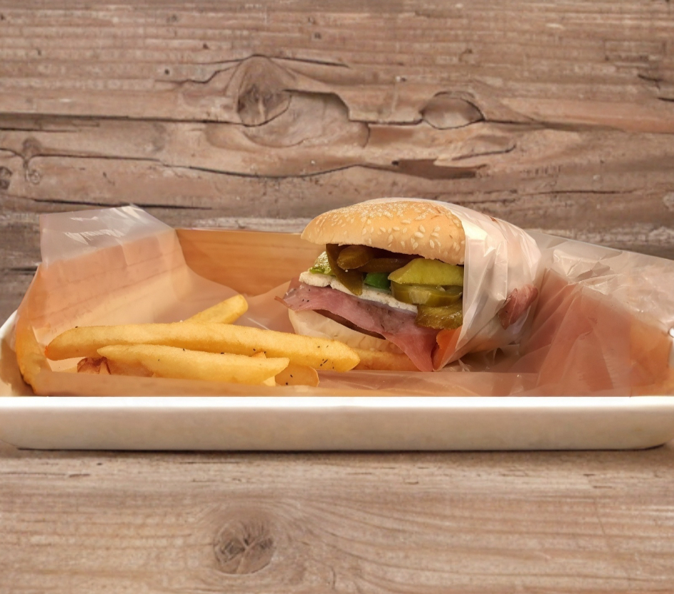 Carne de res, plátano asado, piña, jamón, lechuga y cebolla asada.