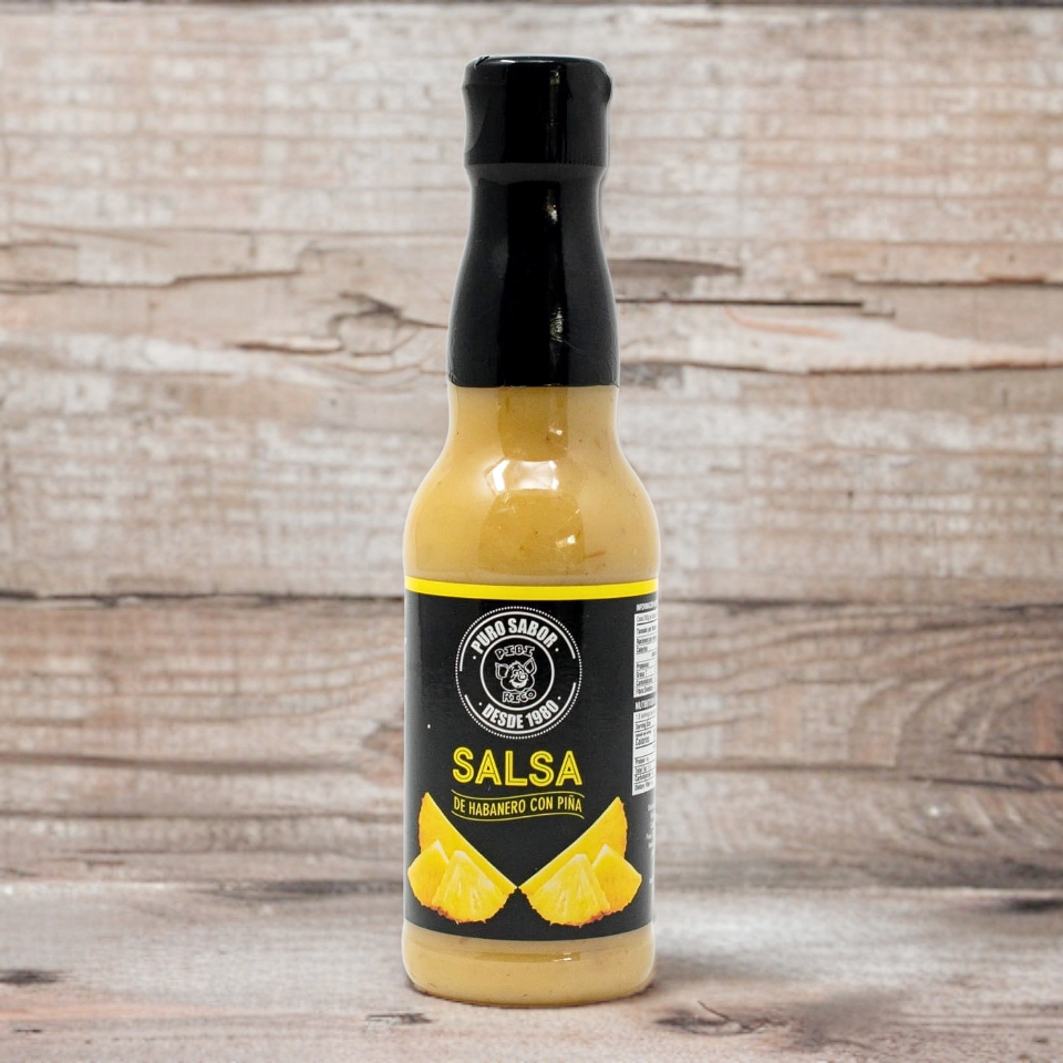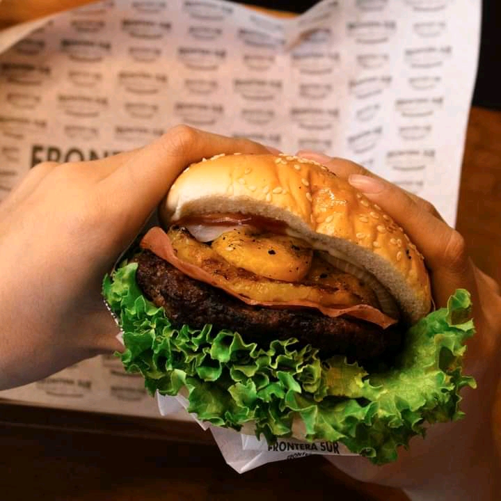 Carne de res, BBQ, cebolla asada, piña, tocino, queso amarillo, jítomate y lechuga.