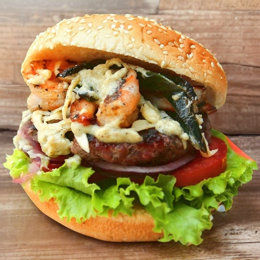 Carne de res, camarones gratinados, aderezo de chile toreado con Philadelphia, rajas, lechuga, jítomate y cebolla morada.