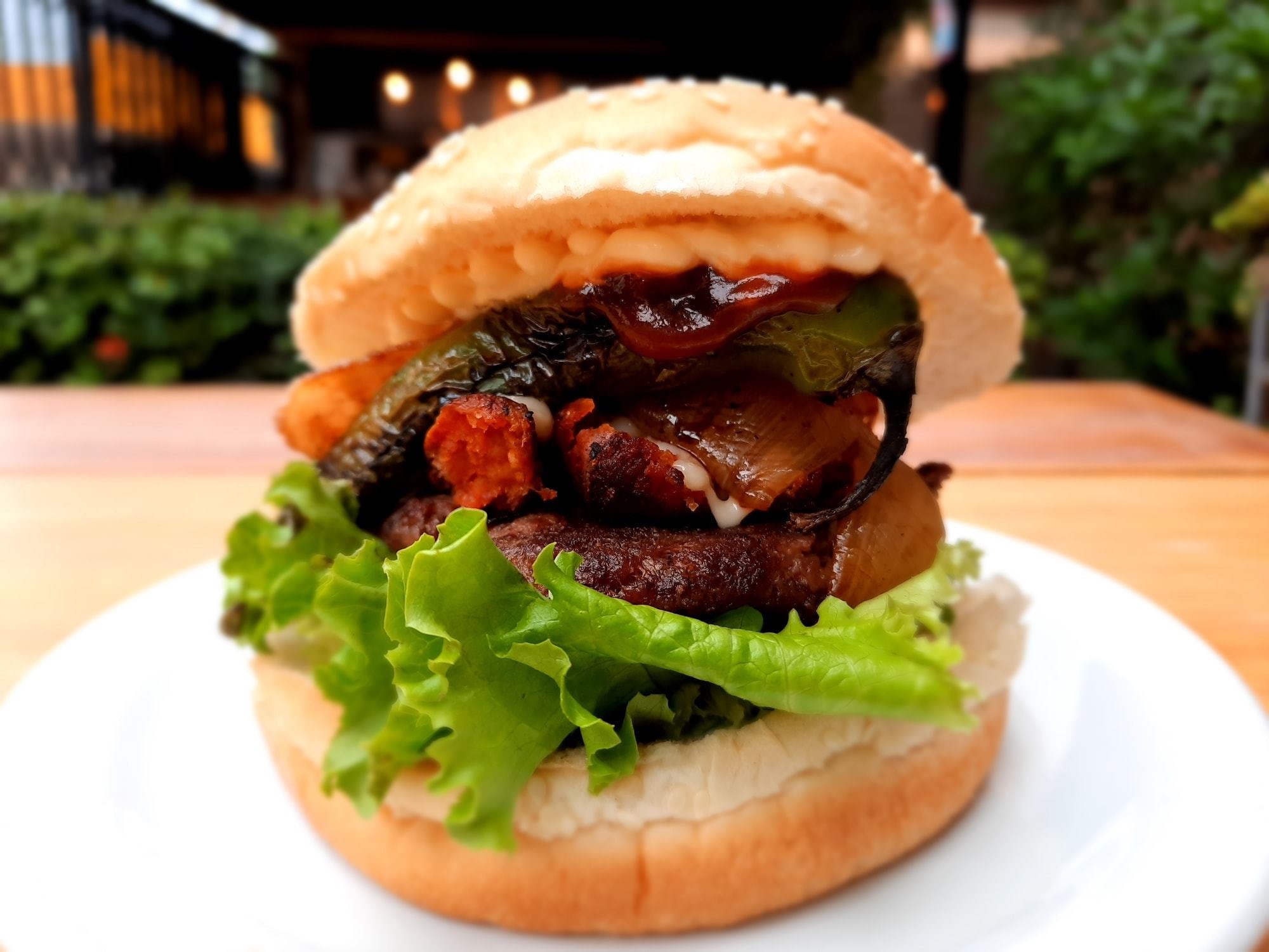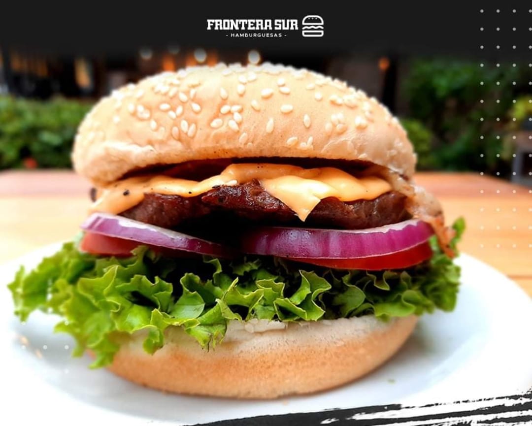 Carne de res, chistorra bañada con manchego, tocino, chile toreado, cebolla asada y lechuga.