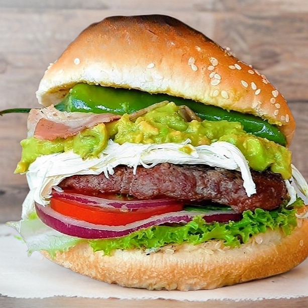 Carne de res, guacamole, chile toreado, quesillo, tocino, jítomate, lechuga y cebolla morada.
