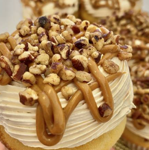 Cupcake cremoso de vainilla relleno de dulce de leche y topping de cajeta con nuez.