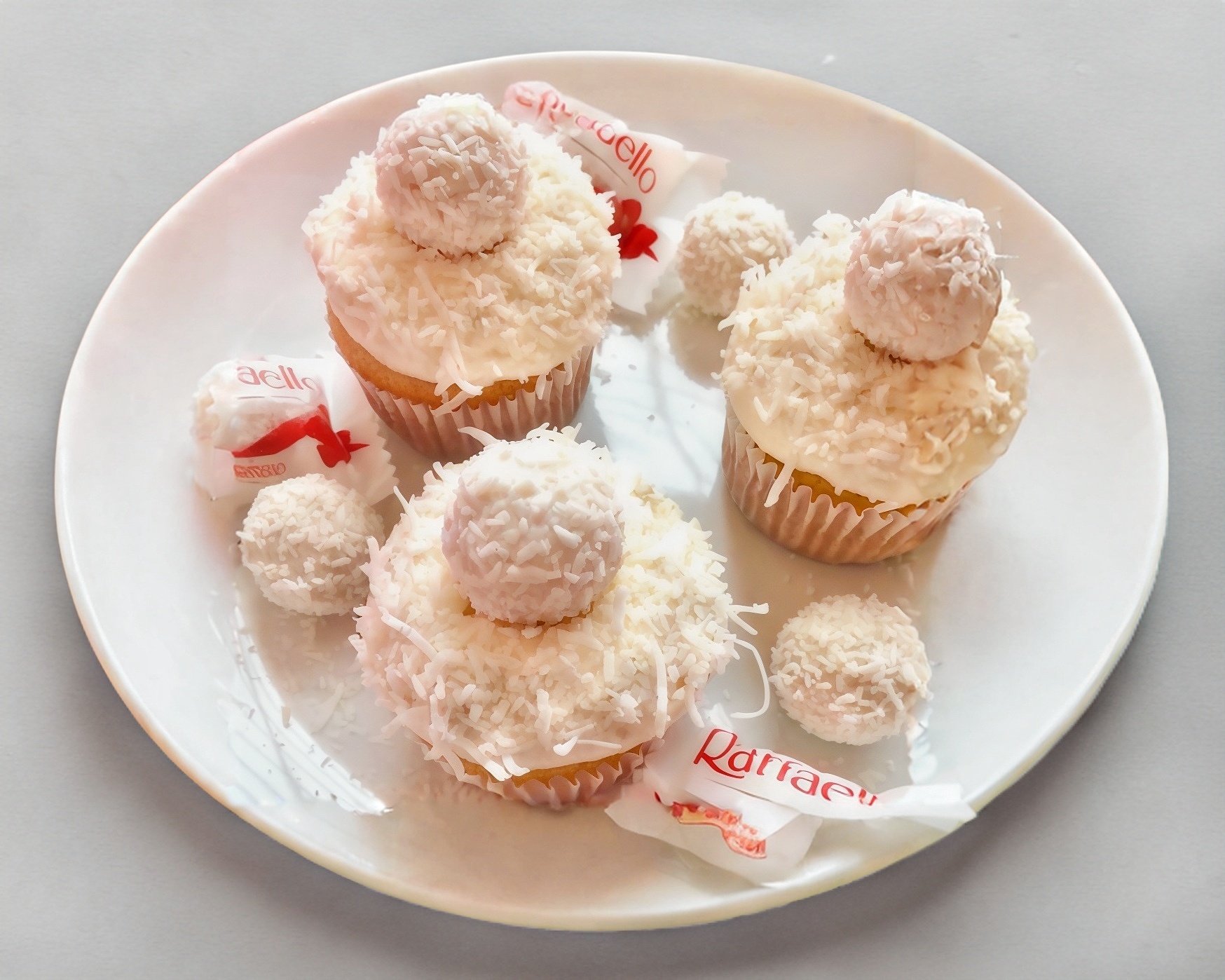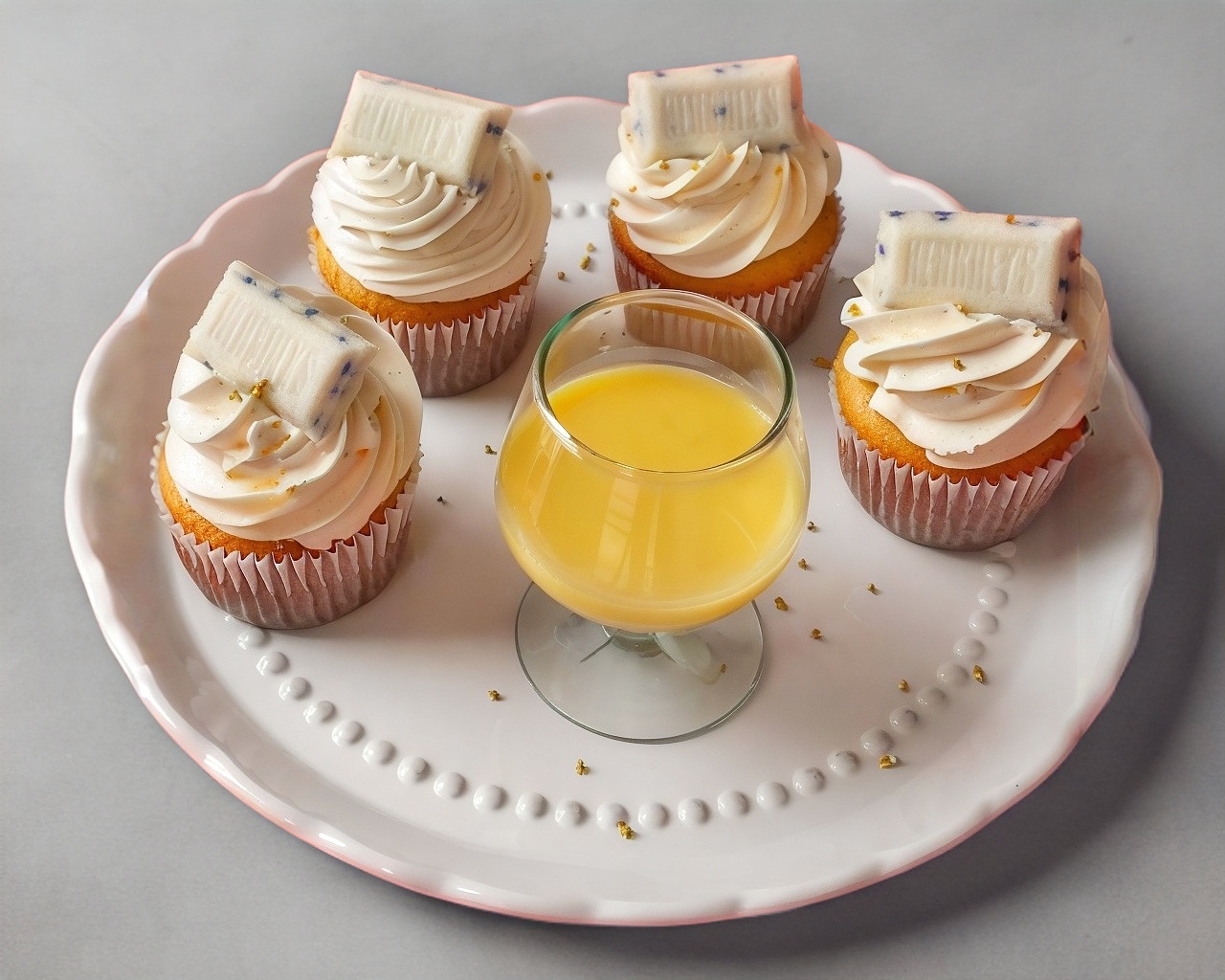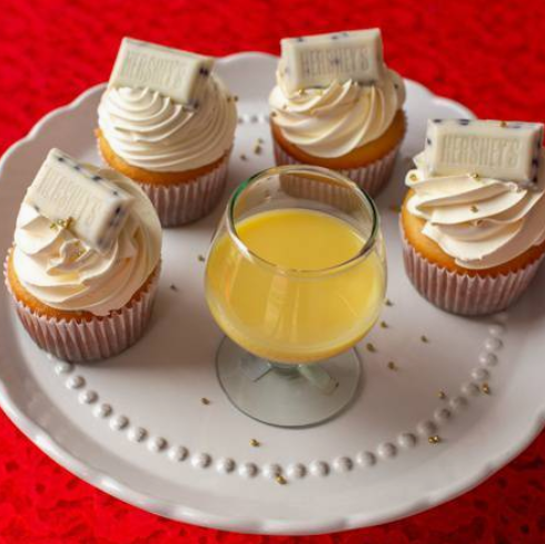 Cupcake cremoso de vainilla relleno de crema de rompope y coronado con chocolate blanco.