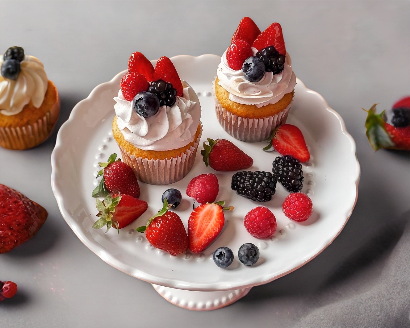 Cupcake de vainilla relleno de mermelada de fresas y topping de crema de queso coronado con frutos.